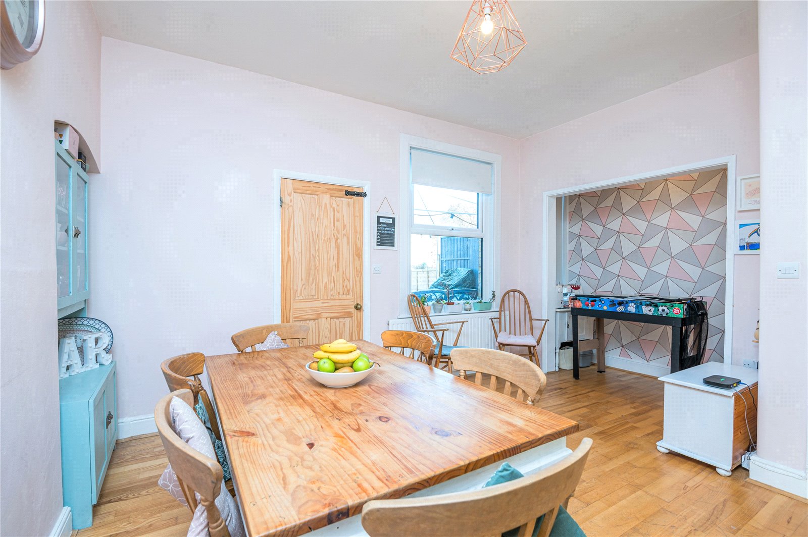 Maximum. Large UPVC double glazed bay window unit to front of lounge area. UPVC double glazed window to rear overlooking rear garden. Two radiators. original feature fireplace with tiled hearth and wooden mantle. Fitted shelving units with storage cupboards beneath. Wood effect laminate flooring trhoughout. Ornate coved cornice to smooth plastered ceiling. Open archway provides access to dining area. Two doors to entrance hall. Storage area with UPVC double glazed window to side. Smooth plastered ceiling. Door provides access to the;