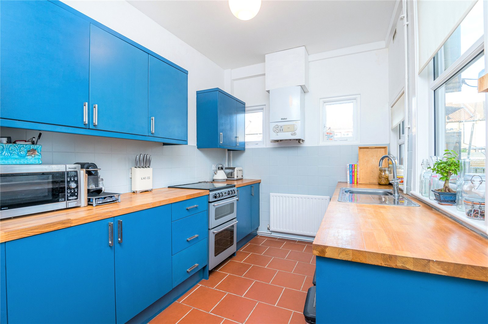 Obscure double glazed door to rear garden. Two UPVC double glazed windows adjacent. Two further windows to rear. The kitchen is fitted with a range of base and eye level cabinets incorporating hardwood squared edge working surface. inset stainless steel sink with drainer unit and mixer tap. Space for gas oven. Space for fridge/freezer. Space and plumbing for washing machine and dishwasher. Wall mounted 'Vaillant' gas fired boiler. Part tiled walls. Fully tiled splashbacks. Tiled floor. Smooth plastered ceiling.