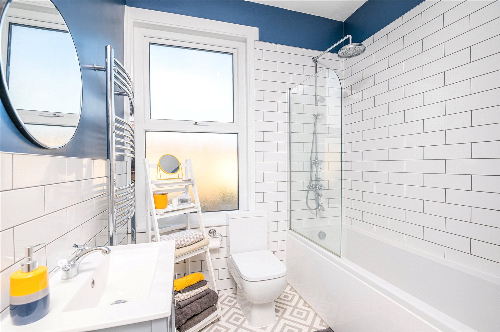 Obscure double glazed UPVC window to rear. Bathroom is fitted with a three piece suite comprising of low flush WC, wash hand basin with mixer taps plus storage cupboard beneath and panelled bath with seperate rainfall shower attachment overhead plus glass screen.Part tiled walls. Tile effect laminate flooring. Storage cupboard to rear. Smooth plastered ceiling. Chrome heated towel rail.