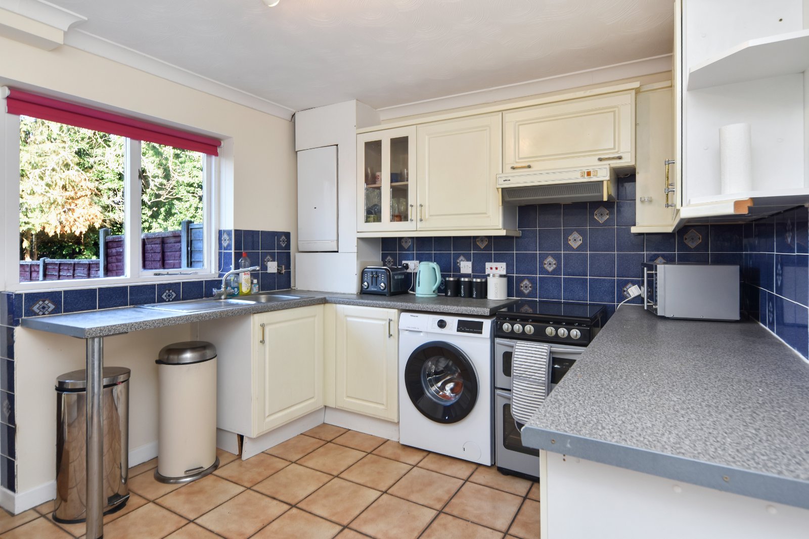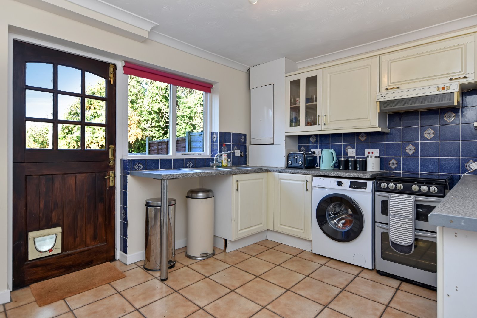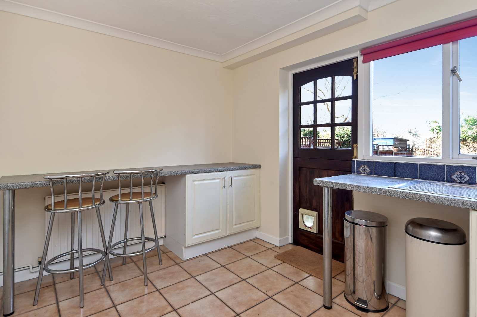 A double glazed window overlooks the rear garden, complemented by a stable-style split door with glazed inserts providing direct outside access. The kitchen is fitted with a range of eye and base level units finished with rolled-edge work surfaces, incorporating a stainless steel sink unit with mixer tap and tiled splashbacks. Freestanding 'Stoves' Double Oven with four ring gas hob and extractor canopy over. There are ample under-counter appliance spaces and a practical breakfast bar seating area. Further features include tiled flooring, radiator, wall-mounted ‘Biasi’ boiler and coving to textured ceiling.