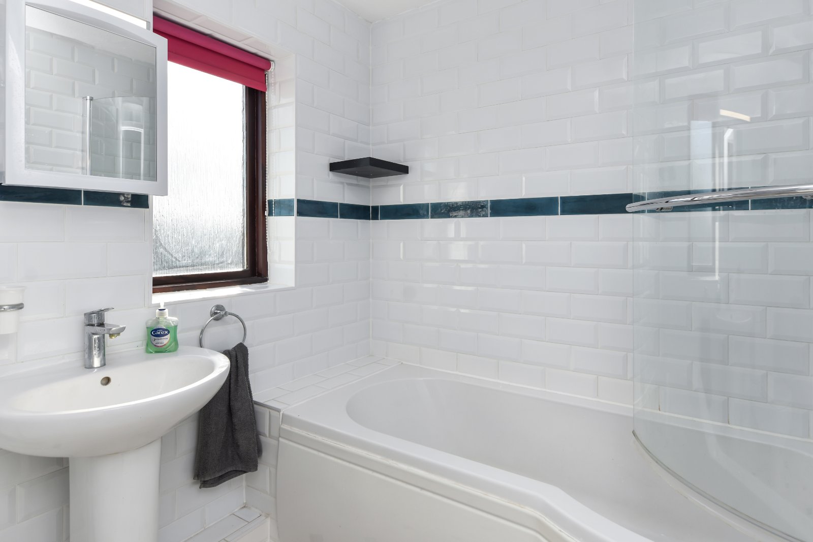 Obscure double glazed window to front aspect. Fitted with a modern white suite comprising a panelled ‘shower bath’ with curved glazed screen, mixer taps and integrated shower, pedestal wash hand basin with mixer tap and low level dual flush WC. Tiling to all visible walls with decorative contrast border. Heated ladder style towel rail. Textured ceiling.