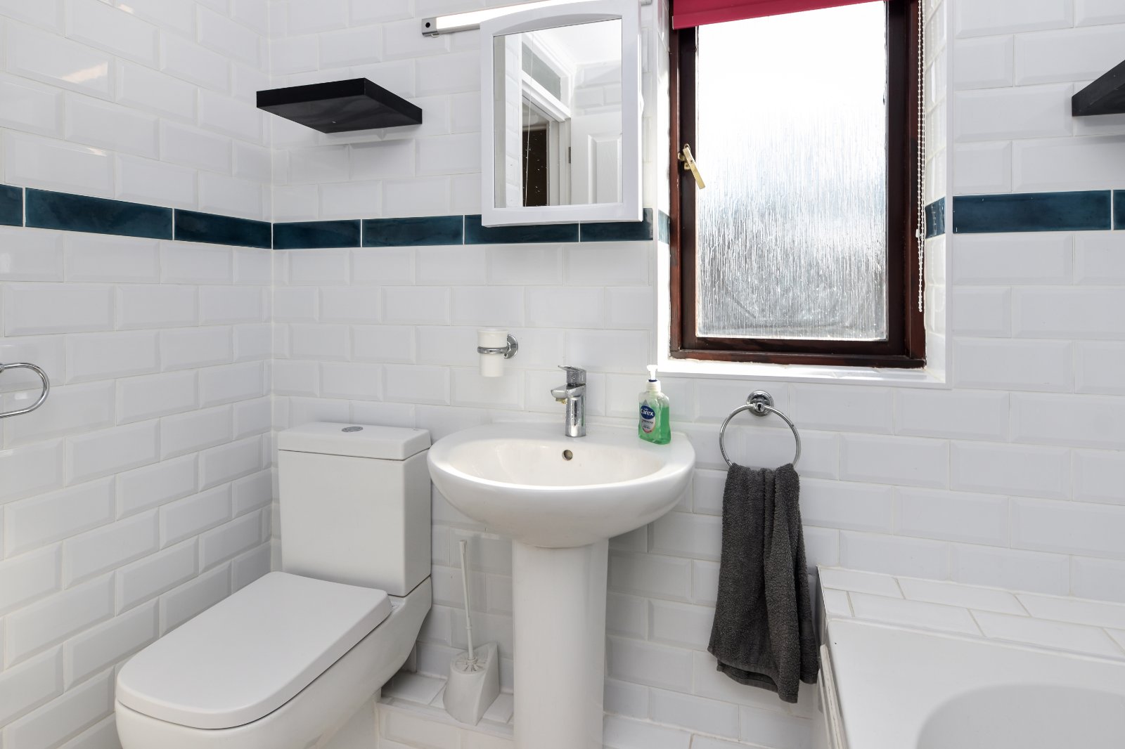 Fitted with a white two-piece suite comprising a corner wash hand basin with tiled splashback and a dual flush low level WC. Further features include tiled flooring, radiator and textured ceiling.