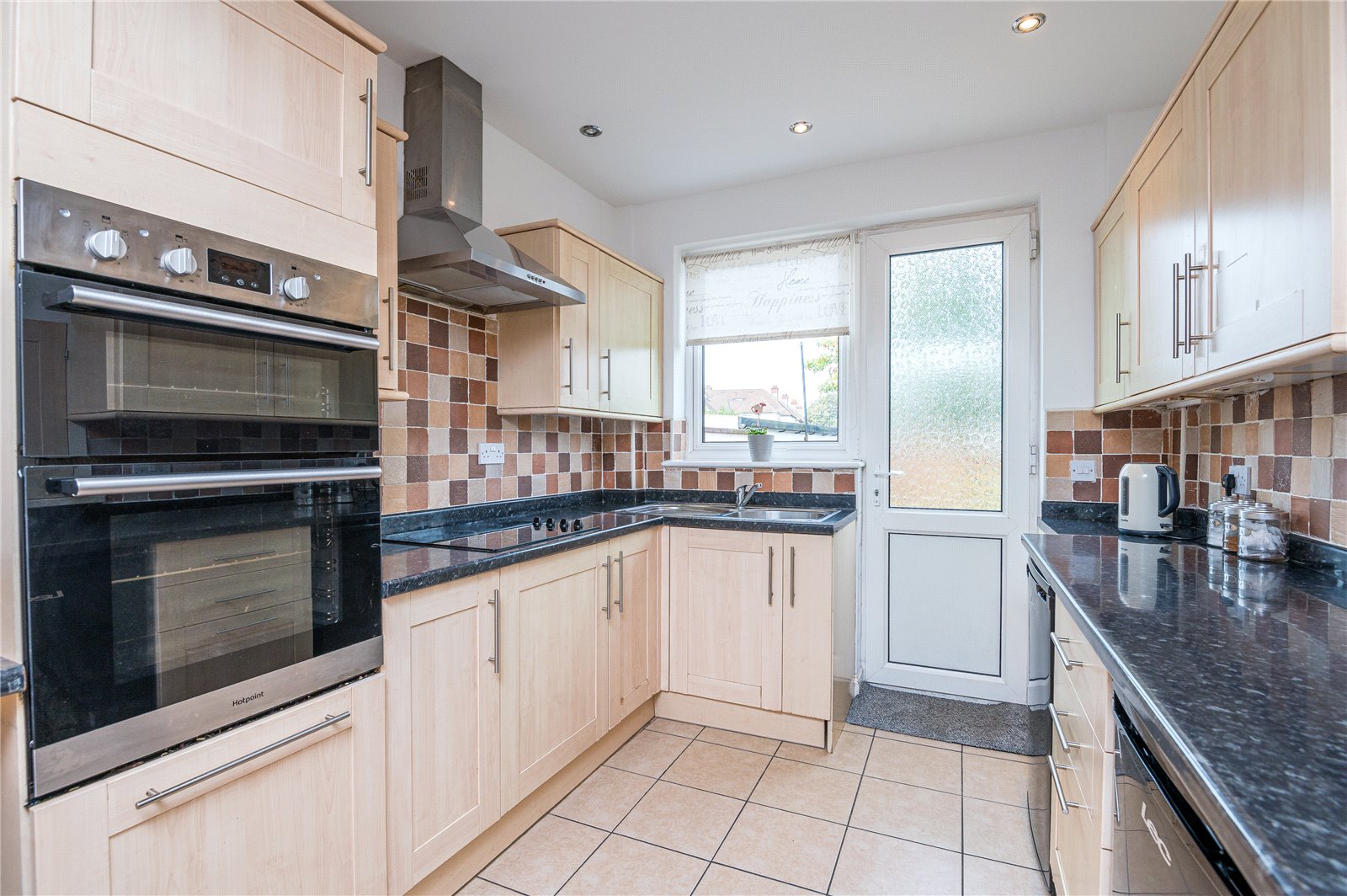 UPVC double glazed door with obscured glazed window to rear leading on to rear garden with UPVC double glazed window adjacent. Kitchen is fitted with a modern range of base and eye level units incorporating a rolled edge working surface. Inset stainless steel sink with drainer unit. Inset four burner hob with canopied extractor hood above. Integrated electric fan assist one and half oven. Space for under counter fridge and freezer. Space and plumbing for washing machine. Breakfast bar area. Serving hatch to side. Fully tiled splash backs. Fully tiled floors. Smooth plastered ceiling with recessed LED lighting. Storage cupboard to side provides additional storage.