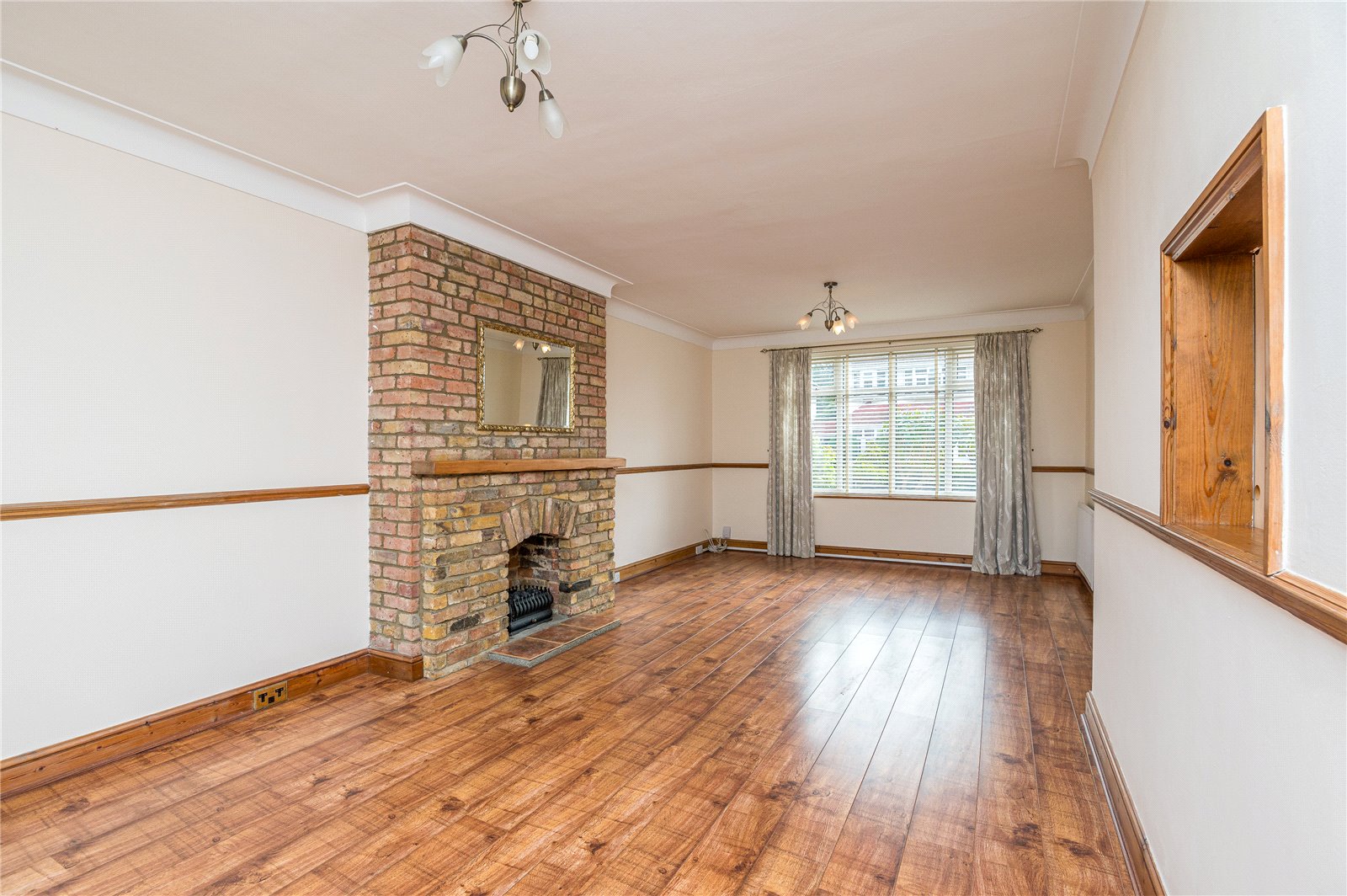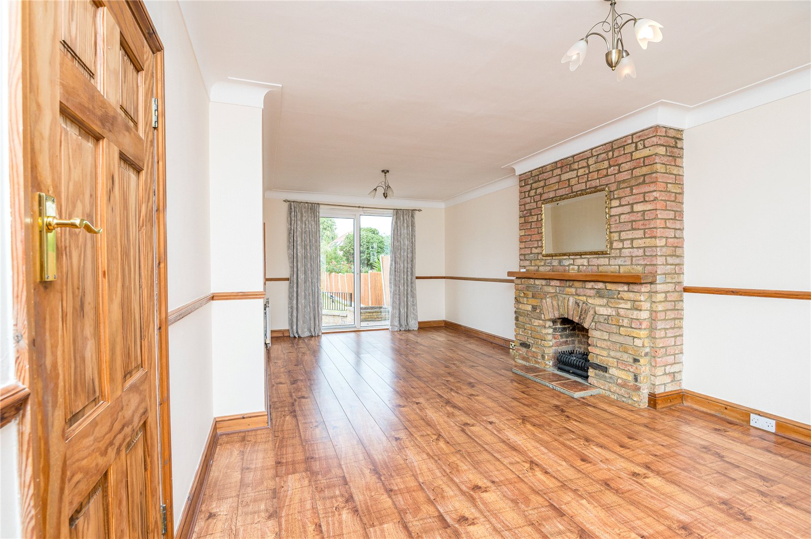 UPVC double glazed patio door to rear leading on to rear garden. Large double glazed window to front. Two wall mounted radiators. Feature brick fireplace with tiled hearth, wooden mantle. Inset gas fire. Serving hatch to side. Wood effect laminate flooring throughout. High level skirting. Feature dado rail. Coved cornice to smooth plastered ceiling.