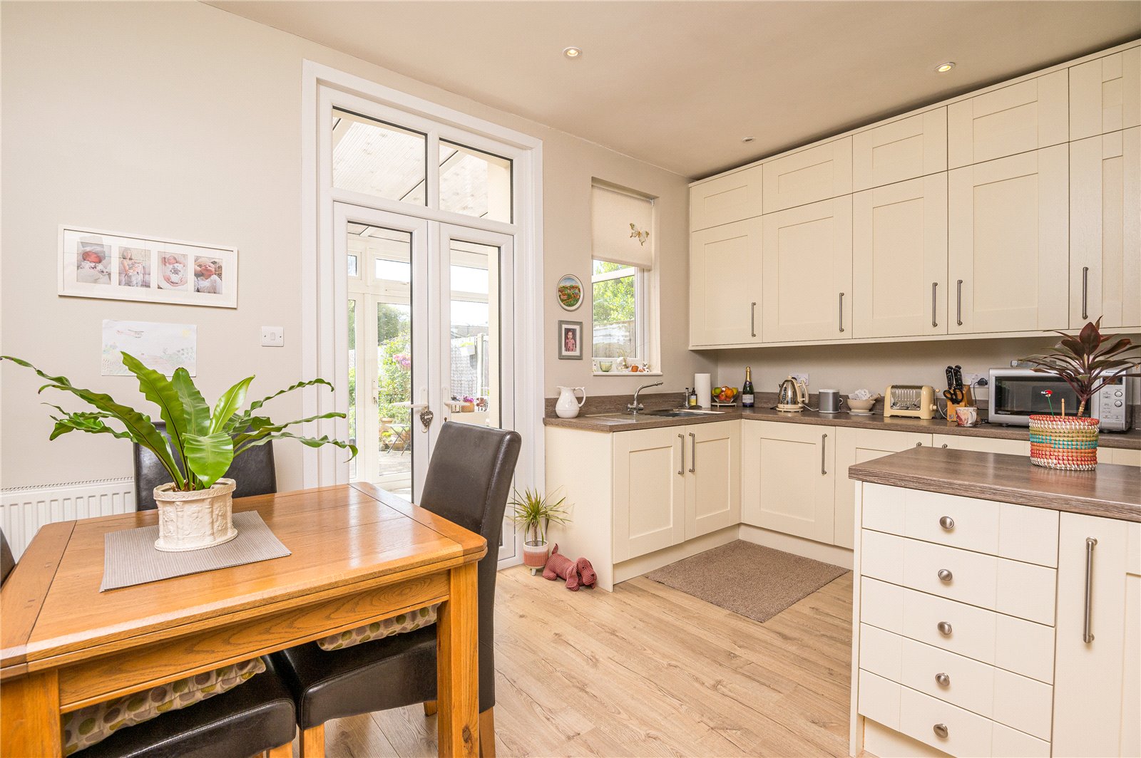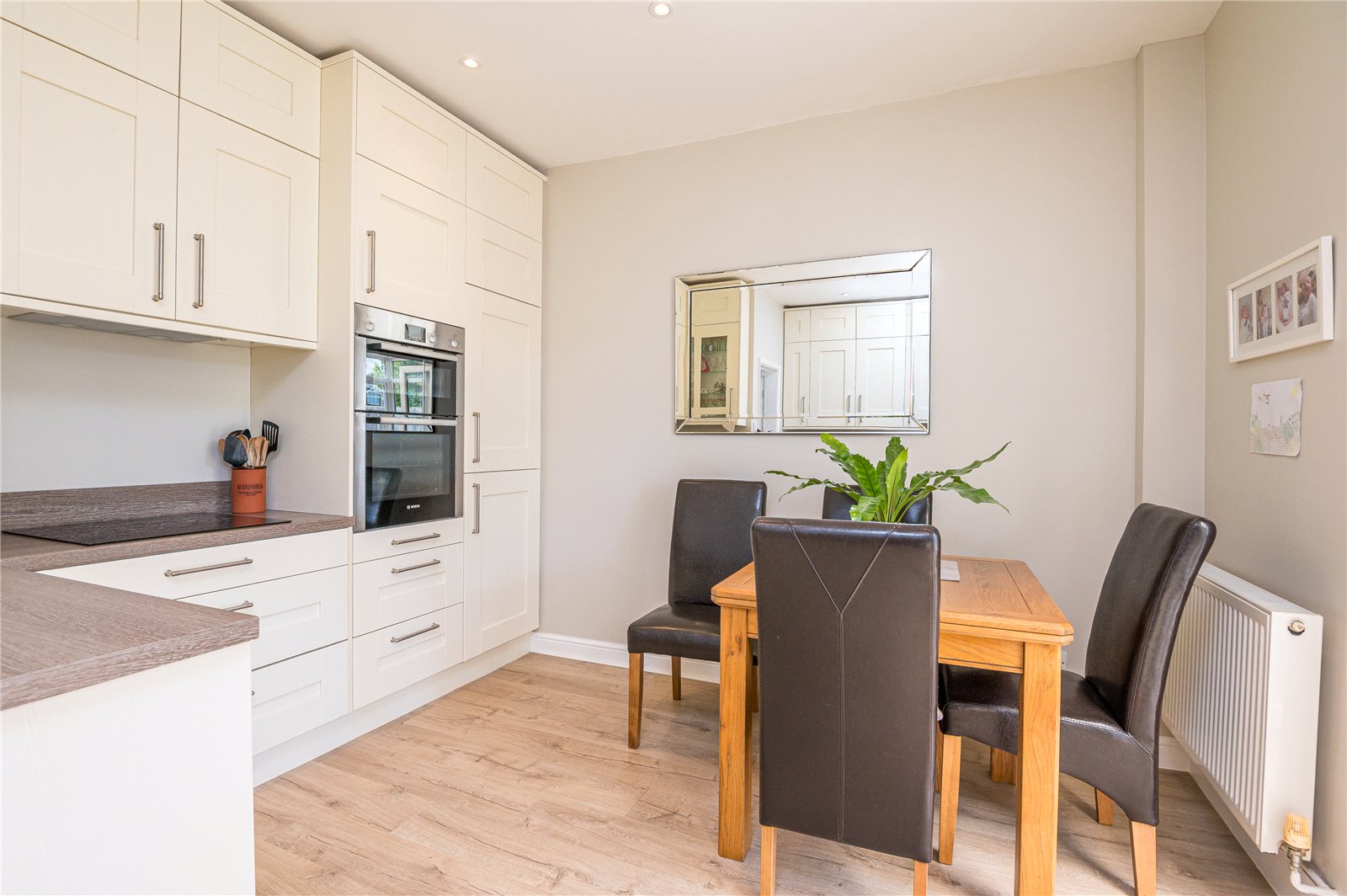 UPVC double glazed French doors to rear leading on to rear conservatory. Further UPVC double glazed window to rear. Kitchen is fitted with a modern range of base and eye level Shaker style front units incorporating a wood effect rolled edge working surface, inset stainless steel sink with mixer tap and drainer unit. Inset four burner induction hob with recessed extractor hood above. Integrated fan assist double oven. Integrated fridge/freezer. Integrated washing machine. Wall mounted radiator. Wood effect laminate flooring. High level skirting. Smooth plastered ceiling with recessed LED lighting.