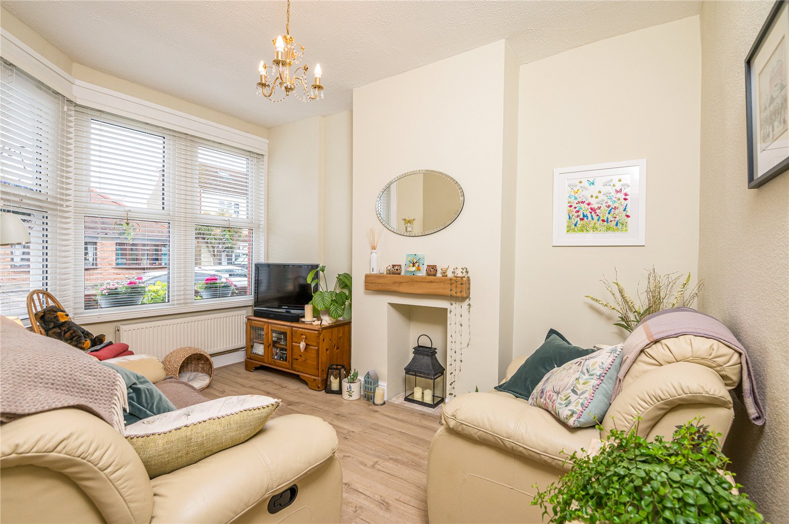 into bay. Large UPVC double glazed bay window unit to front. Wall mounted radiator. Feature fireplace recess with tiled insert with wooden mantle. Wood effect laminate flooring. High level skirting.