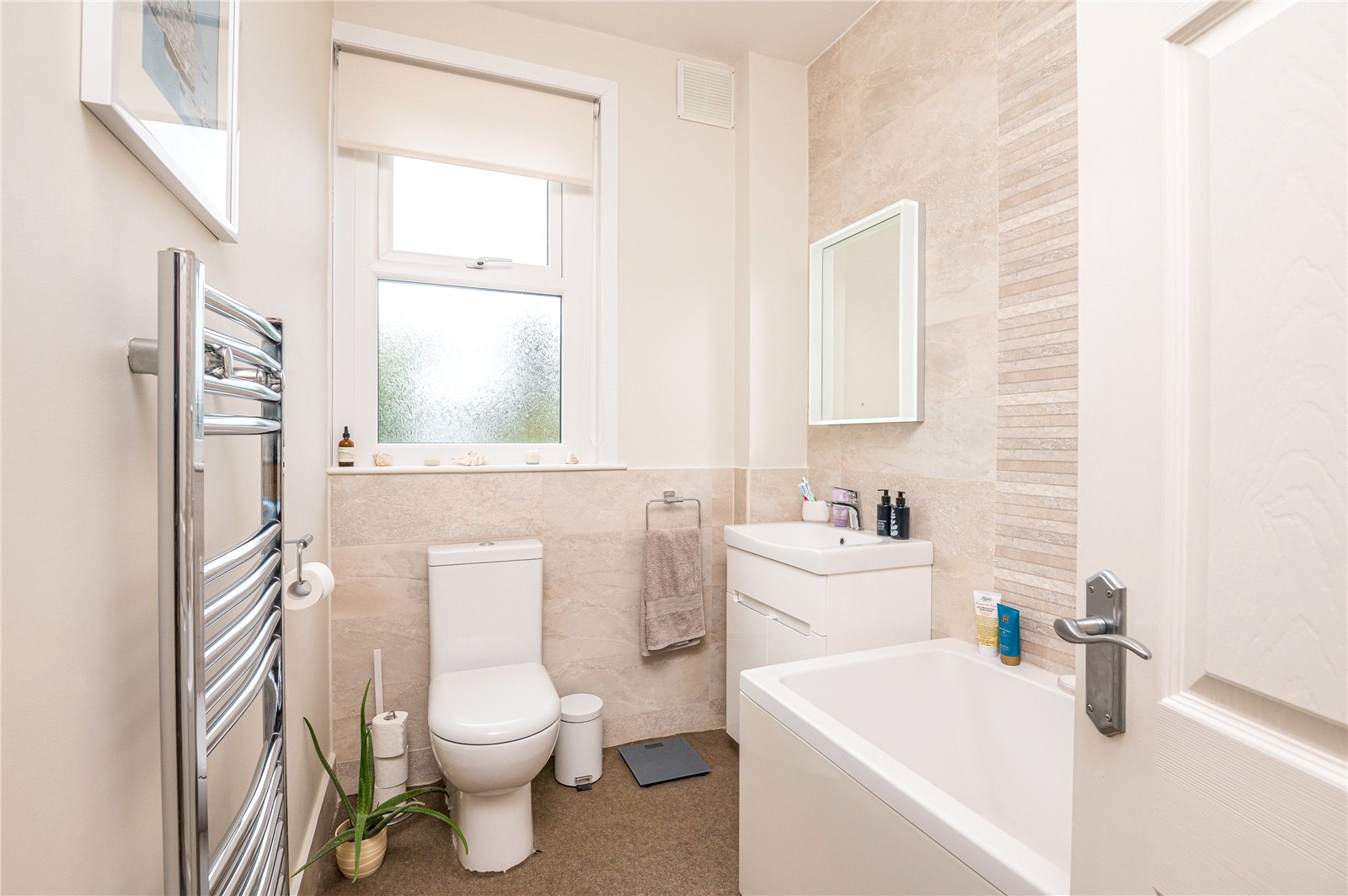 UPVC double obscured glazed window to rear. Bathroom is fitted with a modern and contemporary three piece suite comprising low flush WC, wall mounted wash hand basin with mixer tap and storage cupboard beneath and double ended panelled bath with mixer tap plus separate overhead shower mixer with rainfall showerhead plus adjustable showerhead and glass shower screen. Chrome heated towel rail. Part tiled walls. Smooth plastered ceilings with recessed LED lighting.