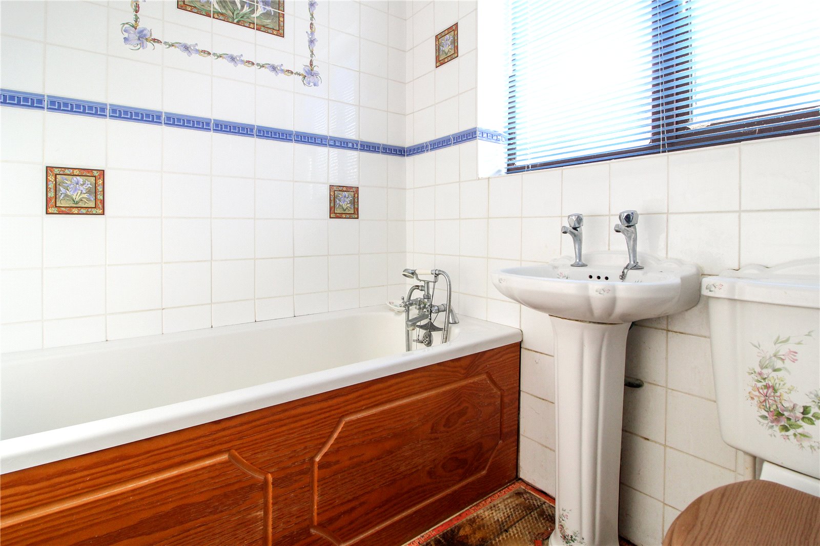 Three piece suite, comprising bath, sink and WC, tiled walls, double glazed obscure window to side aspect.