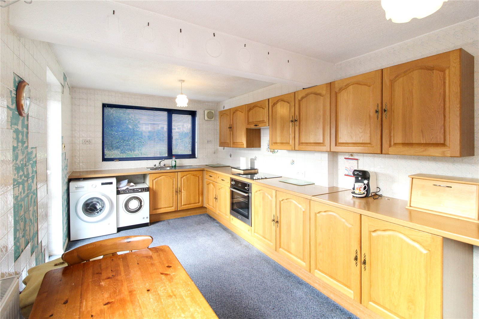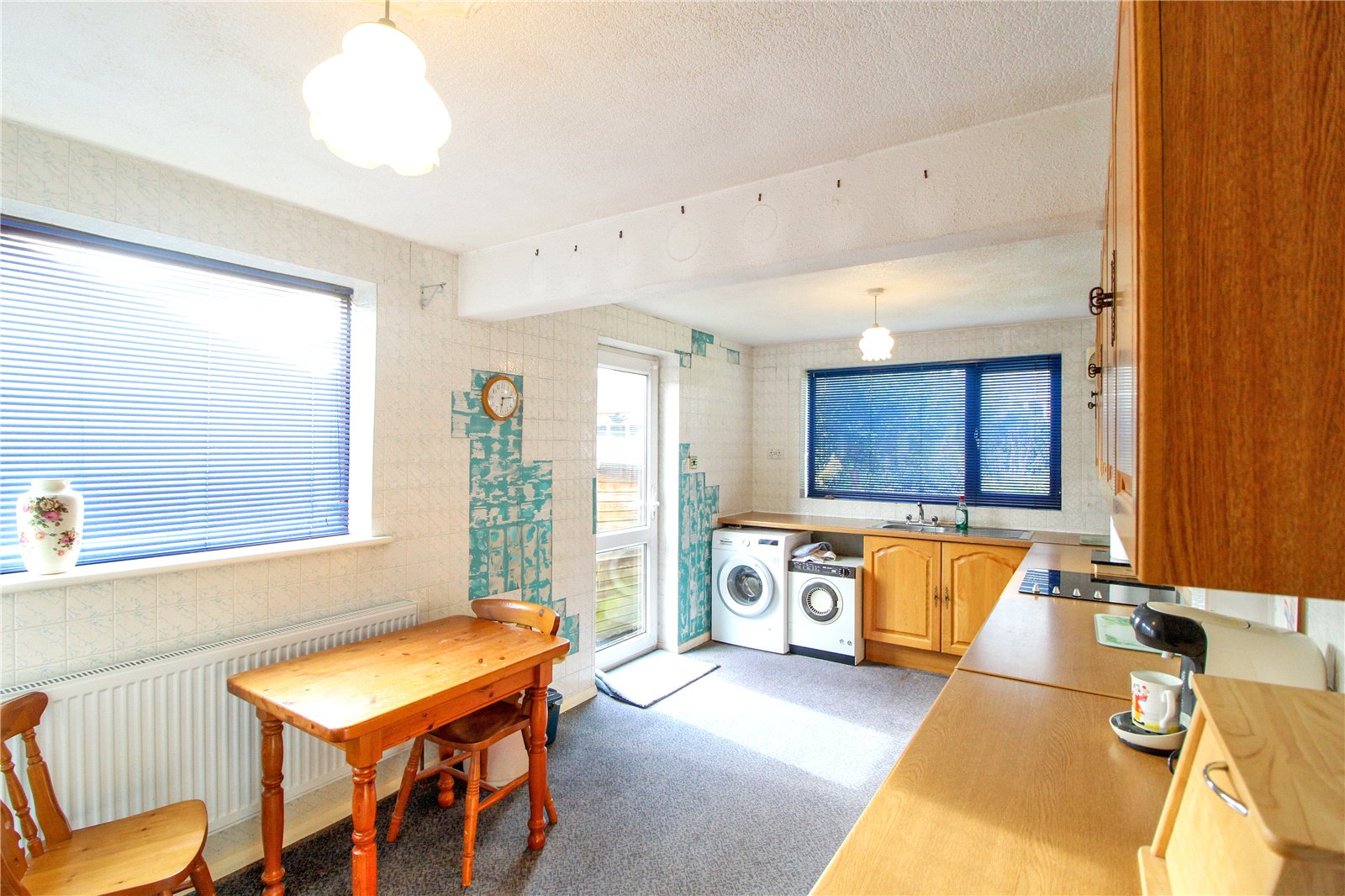 Eye and base level units, sink with drainer unit, space for washing machine, space for fridge freezer, oven, hob, lino to floor, double glazed window to side aspect, double glazed window to rear aspect, double glazed door to rear garden.