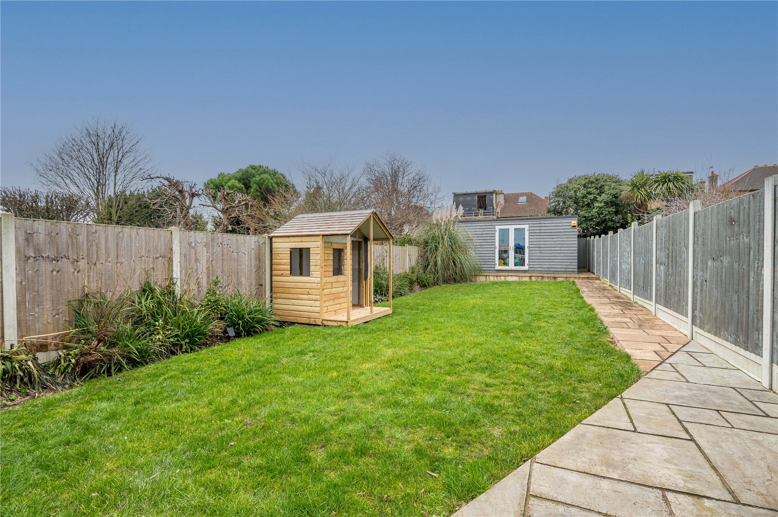 The property benefits from a large West backing rear garden which is mostly laid to lawn with large decking area. Block paved patio to side. Additional raised patio to rear. Access to side. Large garden room with UPVC double patio doors.
