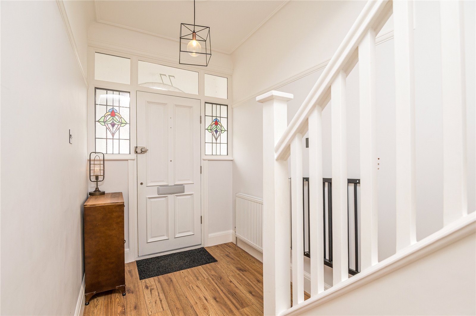 Approached via hardwood front door with double obscured glazed leaded light windows adjacent. Stairs rising to first floor accommodation. Doors lead off to ground floor rooms. Under stairs storage cupboard. Wall mounted radiator. High level skirting. Wood effect laminate flooring. Feature picture rail. Coved cornice to smooth plastered ceiling with feature ceiling rose.