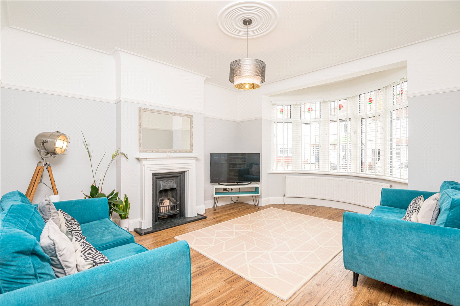 into bay. Large UPVC double glazed leaded light bay window unit to front. Wall mounted radiator. Feature fireplace with wooden mantle, stone hearth, open grate. Wood effect laminate flooring. High level skirting. Feature picture rail. Coved cornice to smooth plastered ceiling with feature ceiling rose.