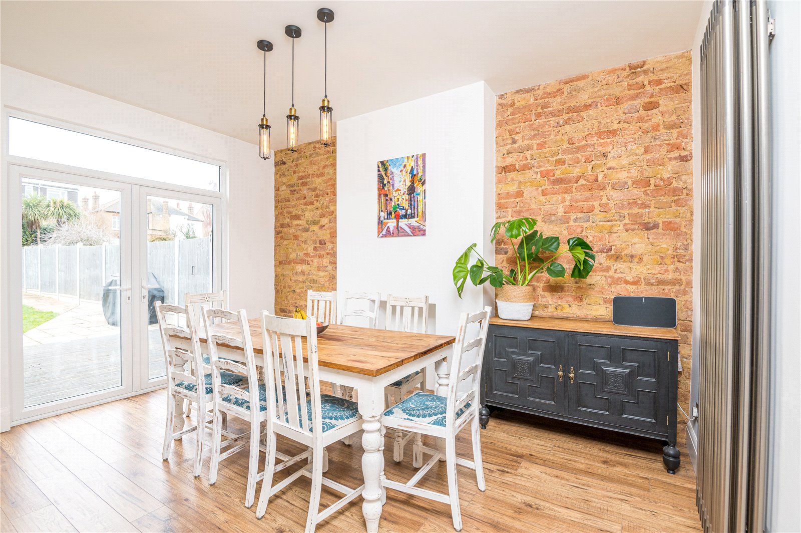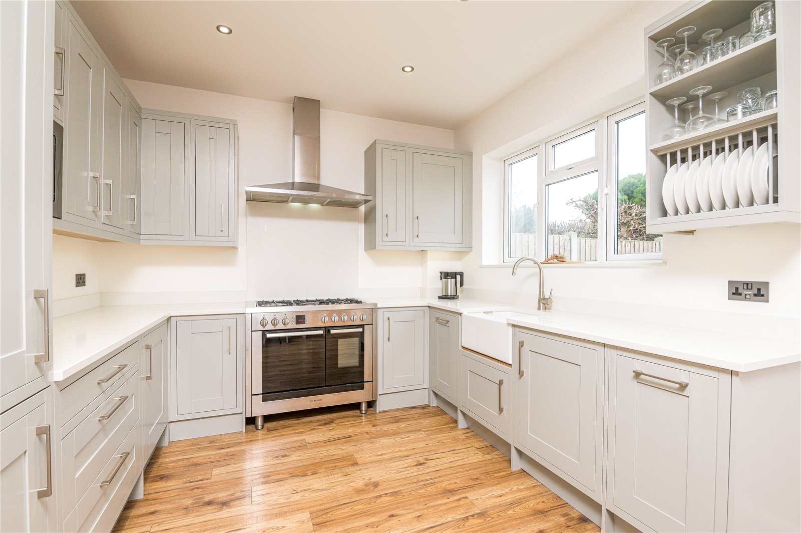 Large UPVC double glazed patio doors leading on to rear garden. UPVC double glazed window to rear. Kitchen is beautifully fitted with a modern and contemporary range of base and eye level cabinets incorporating a Quartz working surface, inset Butler sink with mixer tap and countertop drainer. Bosch Range oven with five burner gas hob, fitted extractor hood above. Integrated undercounter dishwasher, washing machine and tumble dryer. Integrated fridge/freezer and microwave. High level designer radiator. Feature exposed brickwork wall. Wood effect laminate flooring. High level skirting. Smooth plastered ceiling with recessed LED lighting. Further drop pendants.