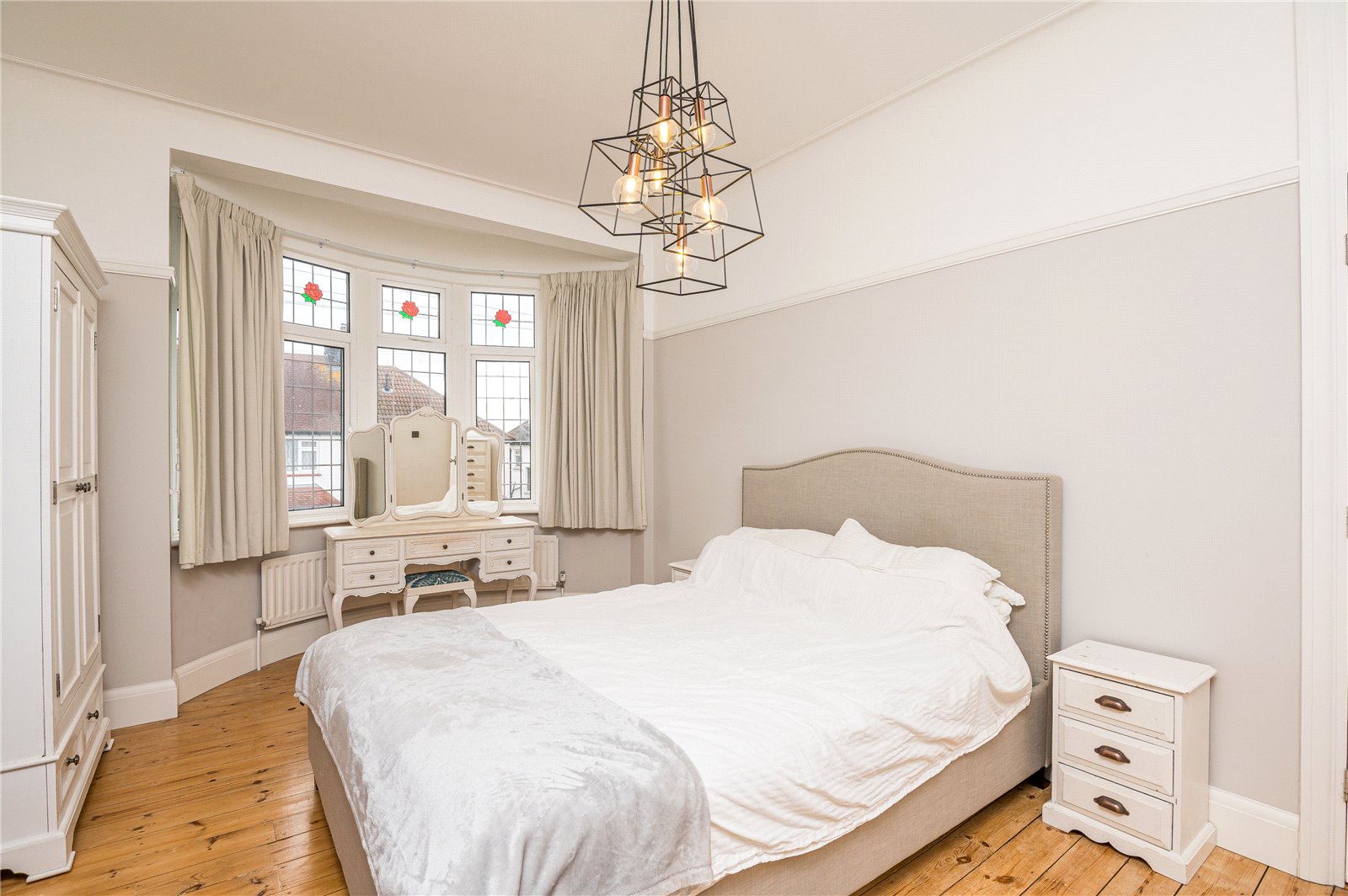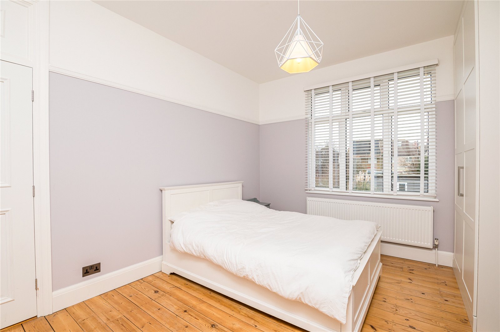 UPVC double glazed leaded light window to front. Wall mounted radiator. Exposed wooden floorboards. High level skirting. Feature picture rail. Coved cornice to smooth plastered ceilings.