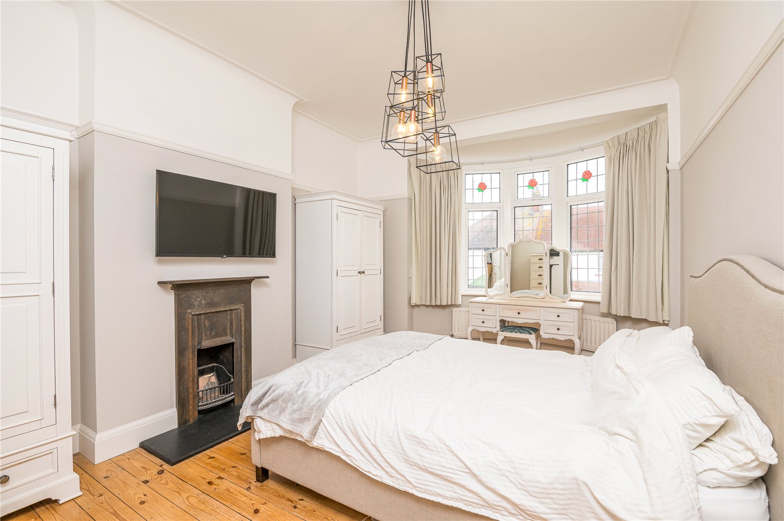 UPVC double glazed window to rear overlooking rear garden. Wall mounted radiator. Feature fireplace with cast iron surround, stone hearth, open grate. Two large fitted wardrobe units. Exposed wooden floorboards. High level skirting. Feature picture rail. Smooth plastered ceilings.