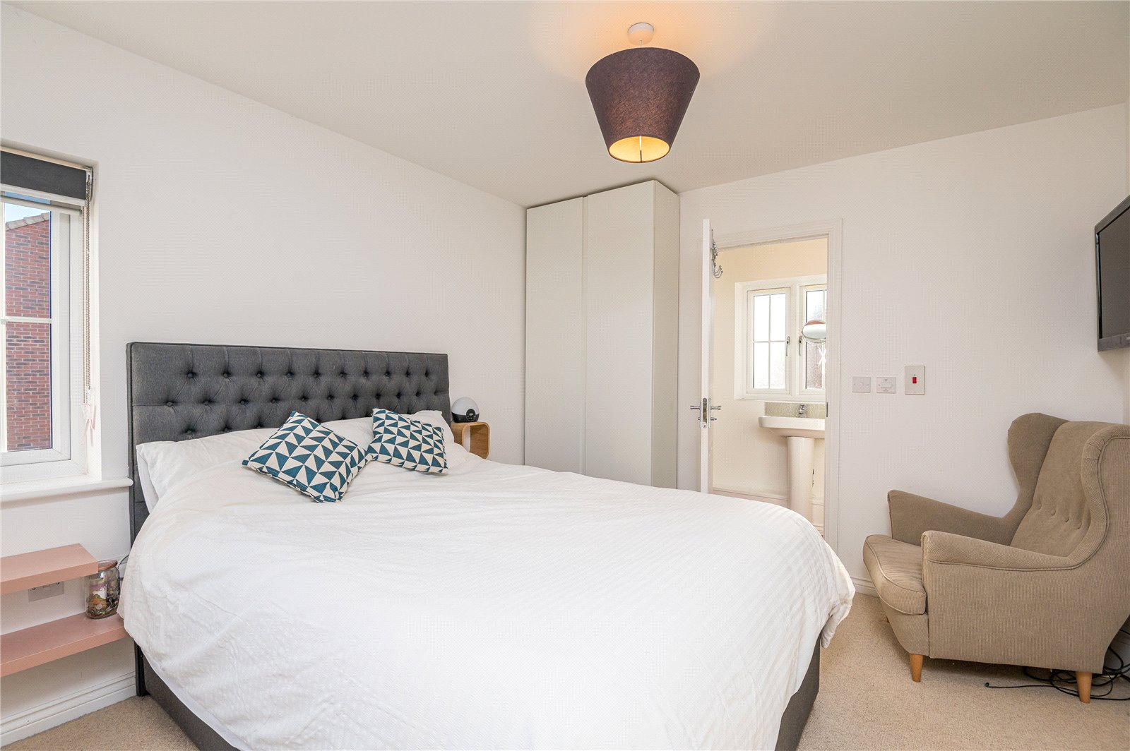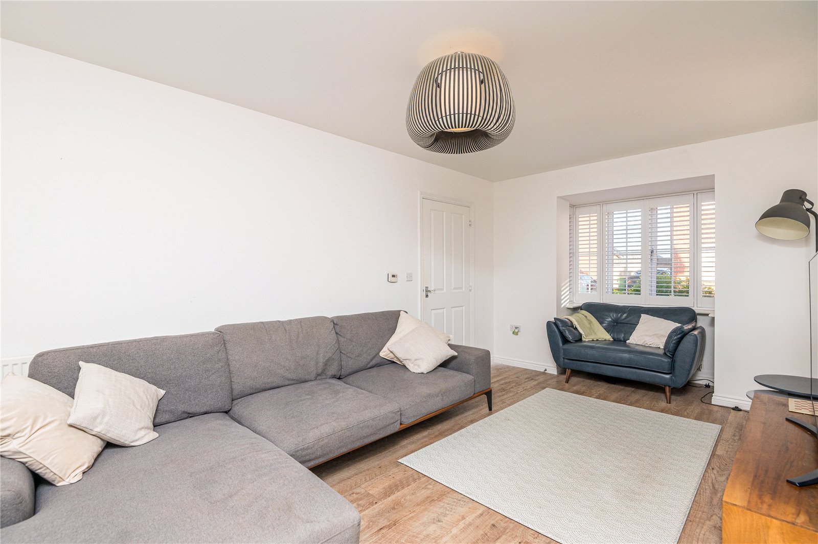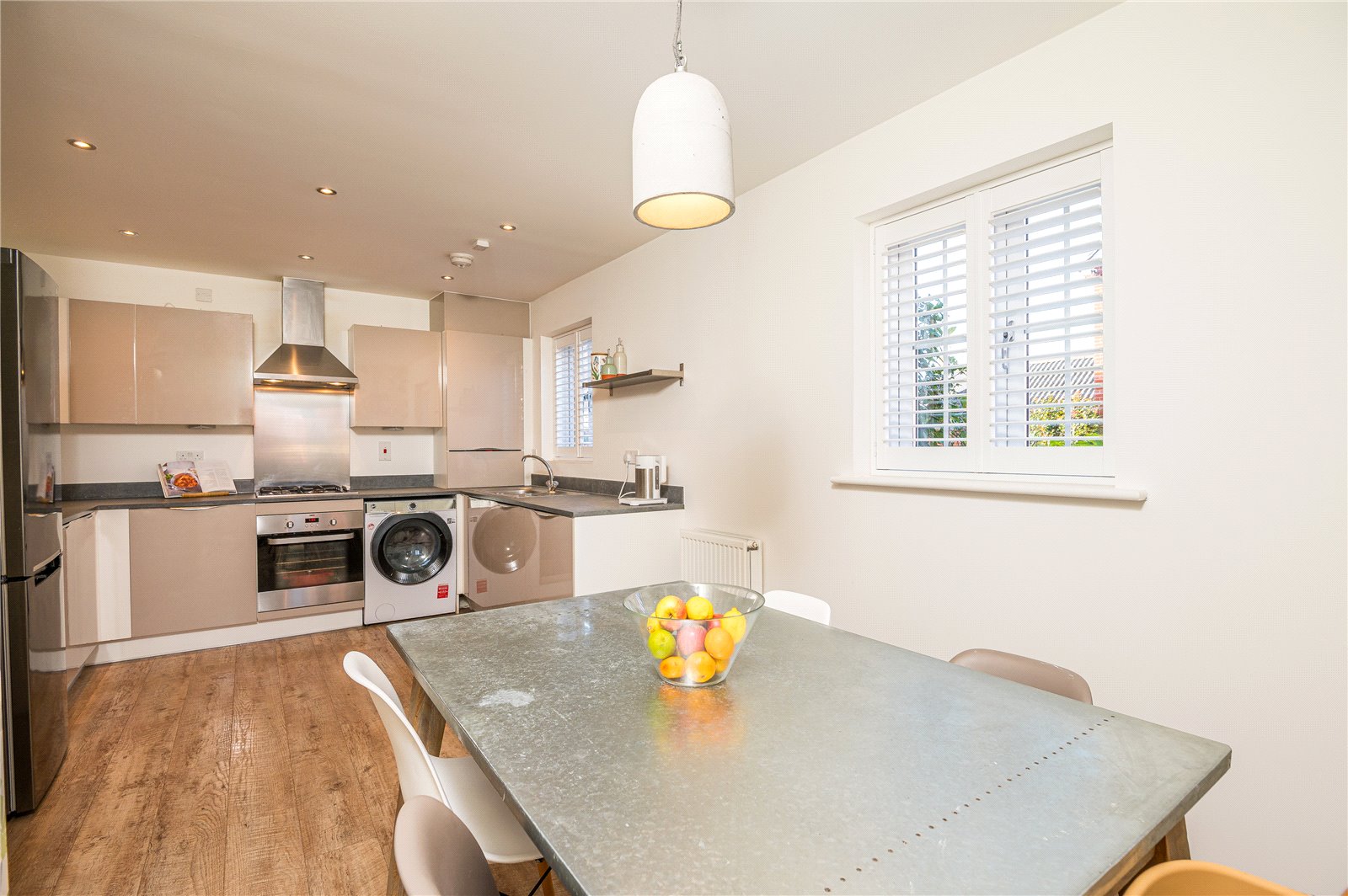 A dual aspect room with uPVC double glazed multi pane square bay window to front with bespoke fitted plantation shutter, and two uPVC double glazed multi pane windows to side with bespoke fitted plantation shutters. Two radiators. Amtico oak effect flooring. The kitchen area is fitted with a comprehensive range of base and frameless eye level cabinets in gloss fronted cappuccino units with squared edged working surfaces and inset stainless steel sink unit with mixer tap. The integrated appliances include split level fan assisted electric oven with four ring gas hob and contemporary extractor canopy, and dishwasher. Space, plumbing and drainage for automatic washing machine. Space for upright fridge/freezer. Access to cupboard housing gas combination boiler serving domestic hot water and central heating system. Smooth plastered ceiling.
