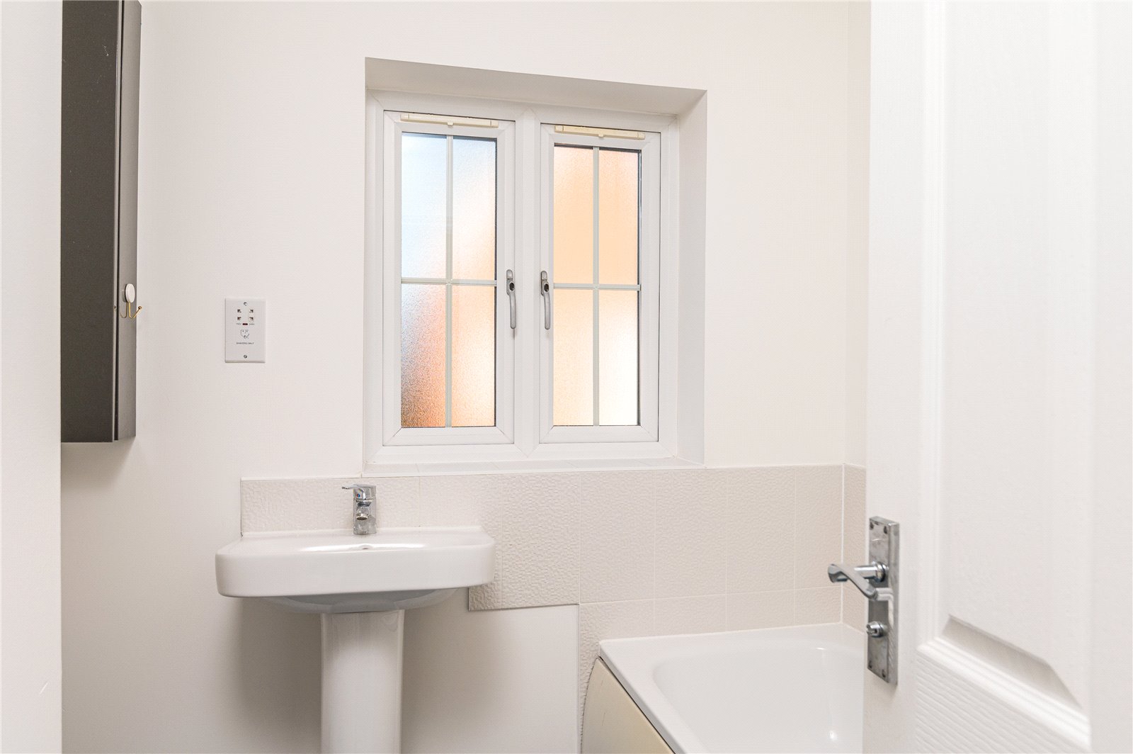 Obscure uPVC double glazed multi pane window to front. Radiator. Fitted with a three piece suite by 'Roca' comprising panel enclosed bath with mixer tap and shower attachment. Pedestal wash hand basin and dual flush close couple W/c. Porcelain tiled splashback tiling. Electric shaver point. Smooth plastered ceiling.