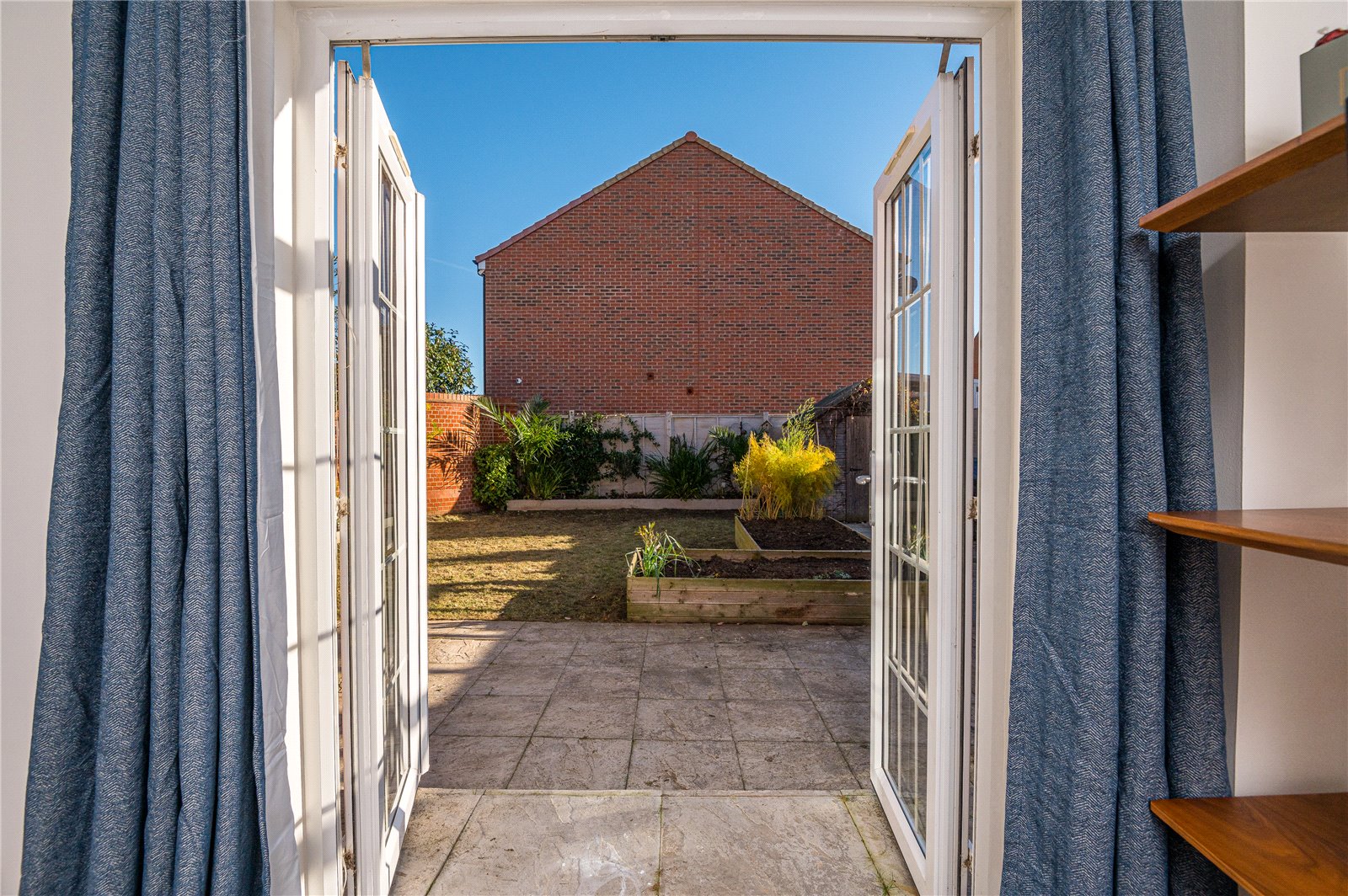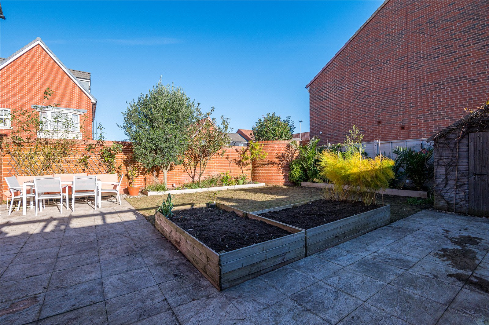 The rear garden commences from the sitting/dining room with a full width slate effect stone patio terrace, ideal for dining al fresco. The terrace extends to the side of the property to a further suntrap terrace, with raised planted flower and shrub beds to both sides and to the centre of the garden. A large expanse of lawn. Fencing to side and rear boundary, with a beautiful full height walled side border. Secure timber gated side access to: