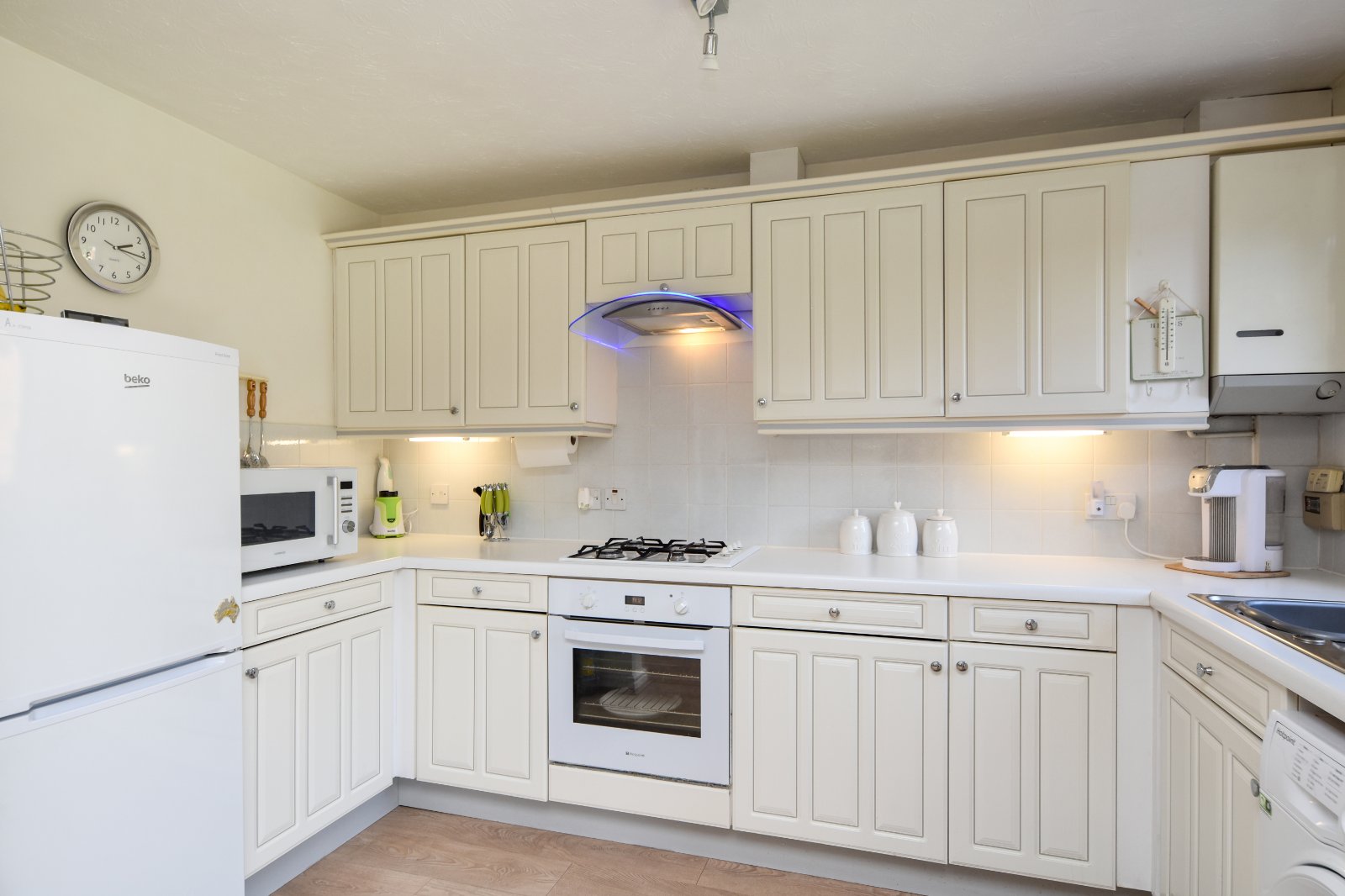 Leaded uPVC double glazed windows to rear aspect. The Kitchen is fitted with a range of eye and base level units with rolled edge working surfaces over inset with stainless steel single drainer 'one-and-a-quarter' sink unit with mixer tap over. Built in electric 'Hotpoint' oven with four ring gas hob over and contemporary LED lit extractor canopy over. Under counter 'Hotpoint' washing machine (to remain). Upright 'Beko' fridge/freezer (to remain). Wall mounted boiler. Splashback tiling. Laminate wood effect flooring. Coving to textured ceiling.