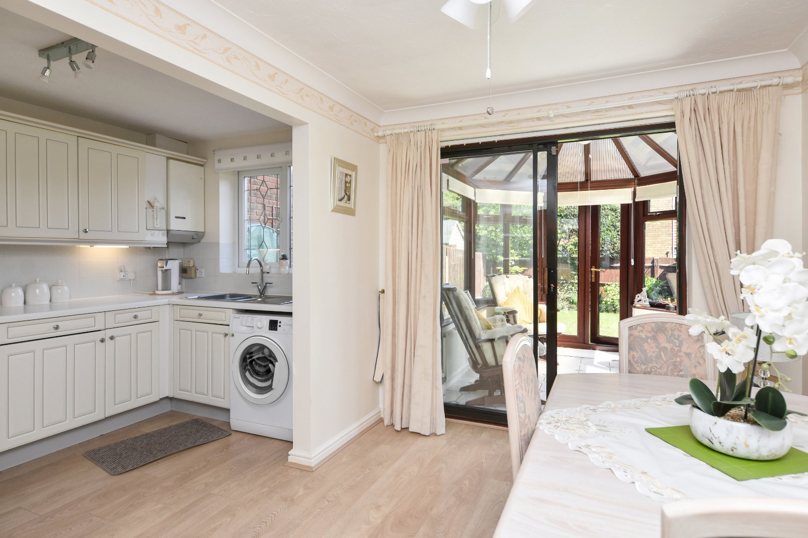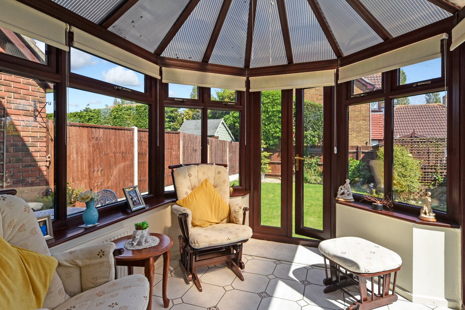 Offering triple aspect views with dual aspect access. Pair of sliding uPVC double glazed doors to side aspect with further pair of french doors leading to the rear garden. Polycarbonate pitched roofline inset with ceiling mounted fan and lighting. Tiled flooring, Radiator.