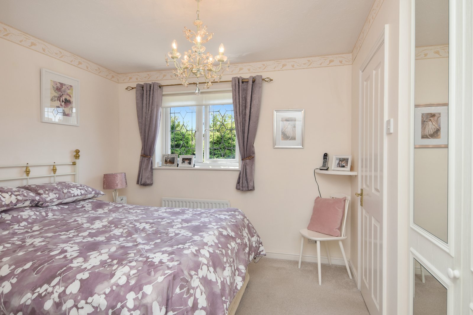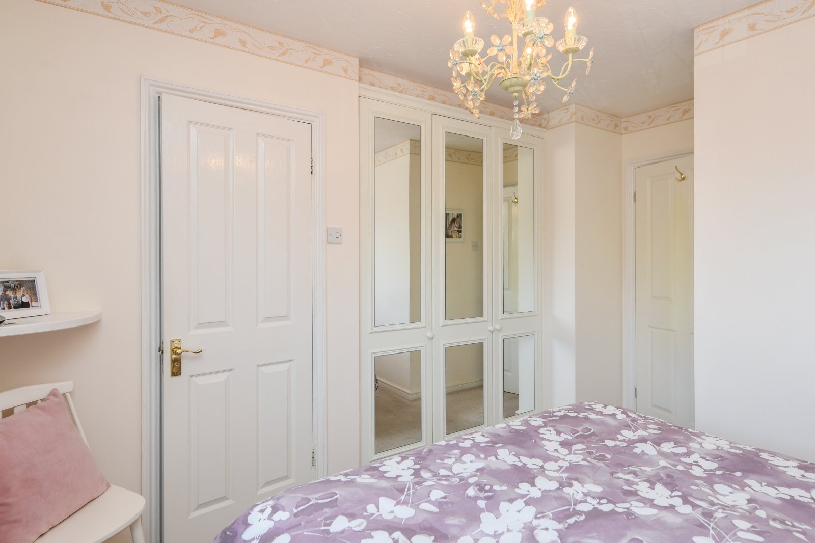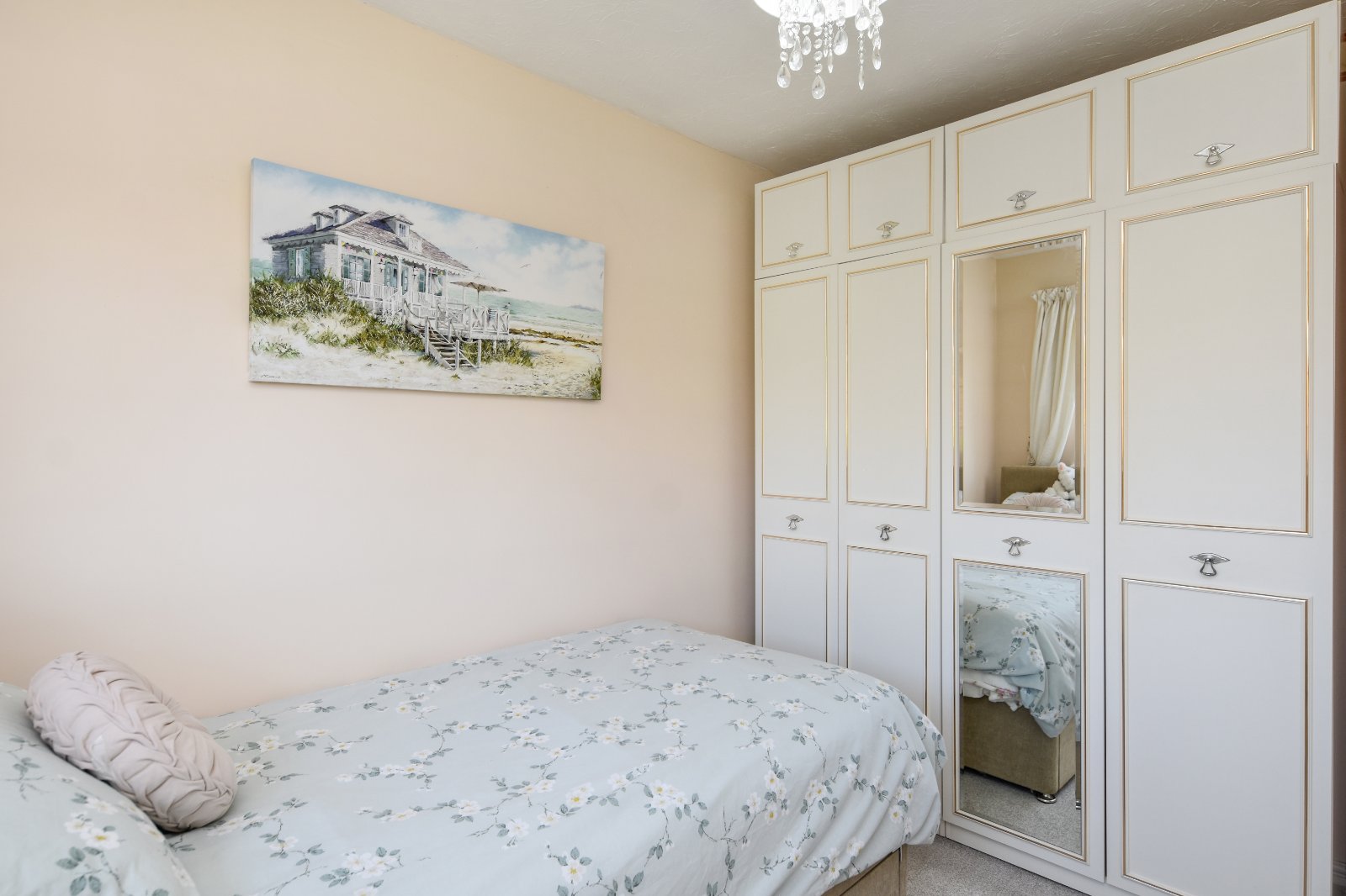 Leaded uPVC double glazed window to rear with views towards the open green area. Radiator. Freestanding two door wardrobes (to remain). Textured ceiling.