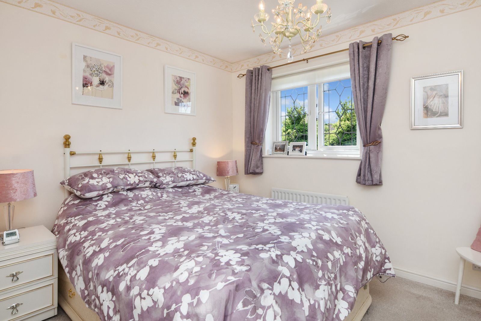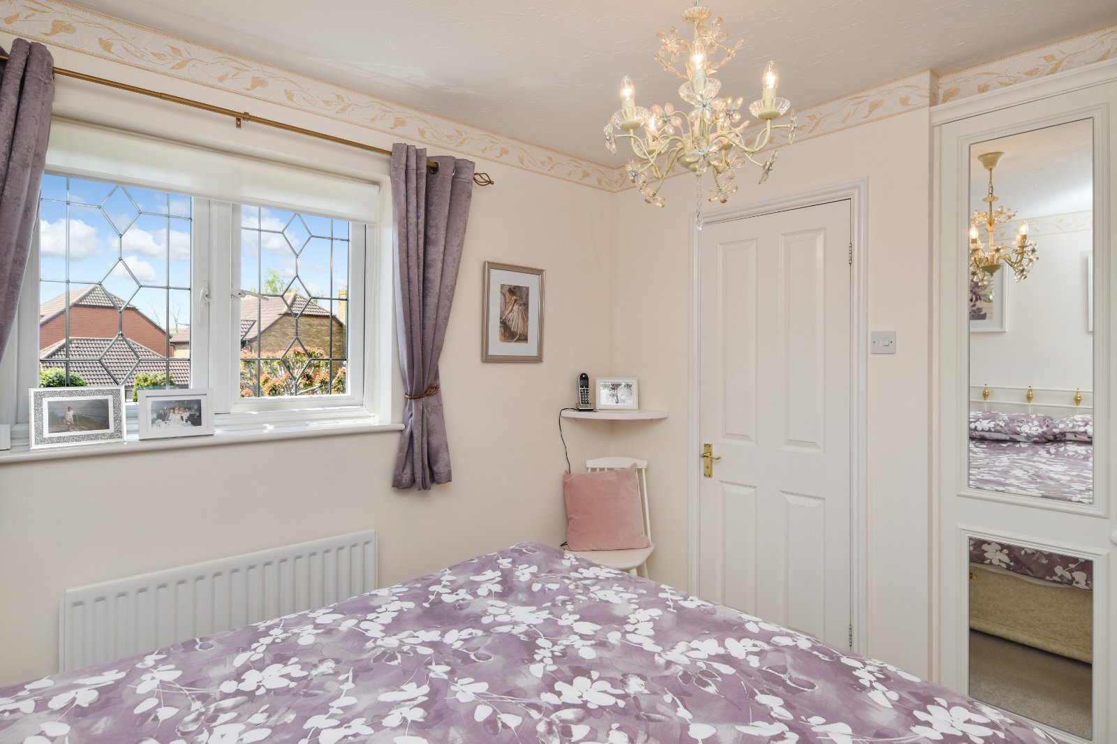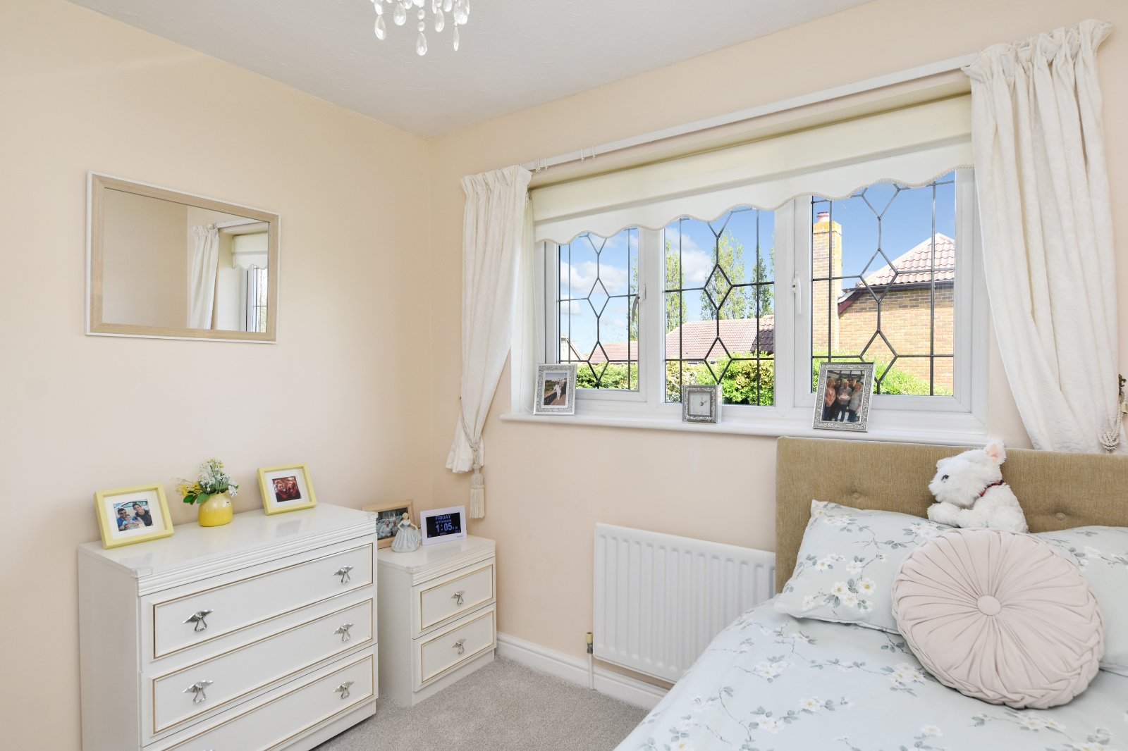 Leaded uPVC double glazed window to rear with views towards the open green area. Radiator. Freestanding two door wardrobes (to remain). Textured ceiling.