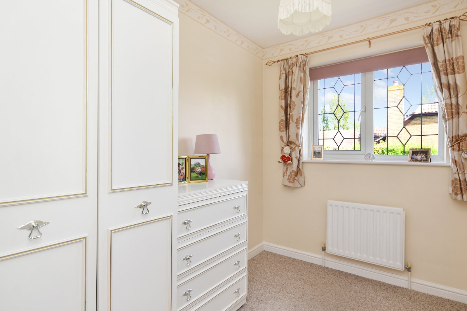 Leaded uPVC double glazed window to rear with views towards the open green area. Radiator. Freestanding range of wardrobes (to remain). Textured ceiling.