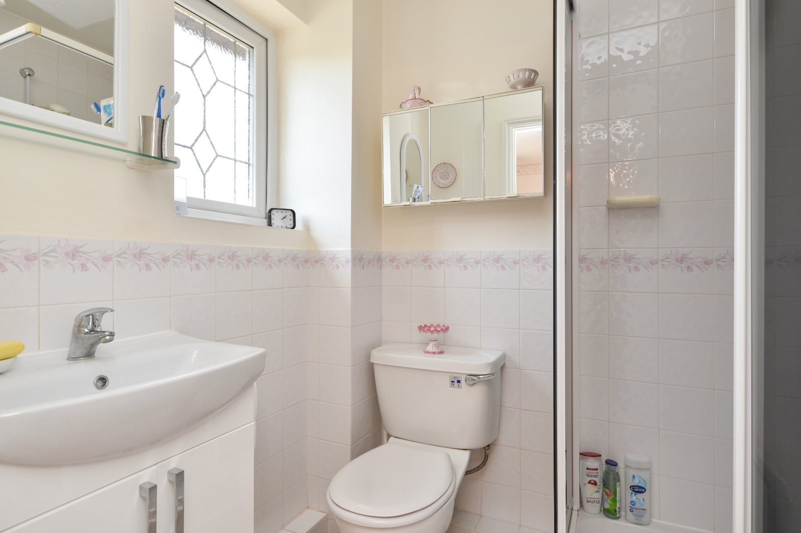 Obscure leaded uPVC double glazed windows to front aspect. The white three piece suite comprises a vanity wash hand basin with mixer tap over and storage cupboards under, low level flush wc and independent shower enclosure with integrated shower unit. Partly tiled walls. Radiator. Shaver point. Textured ceiling inset with ceiling mounted extractor fan.