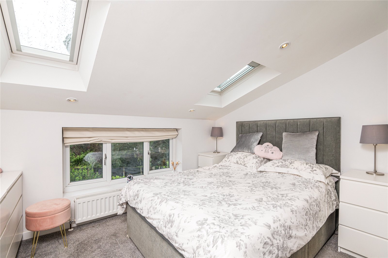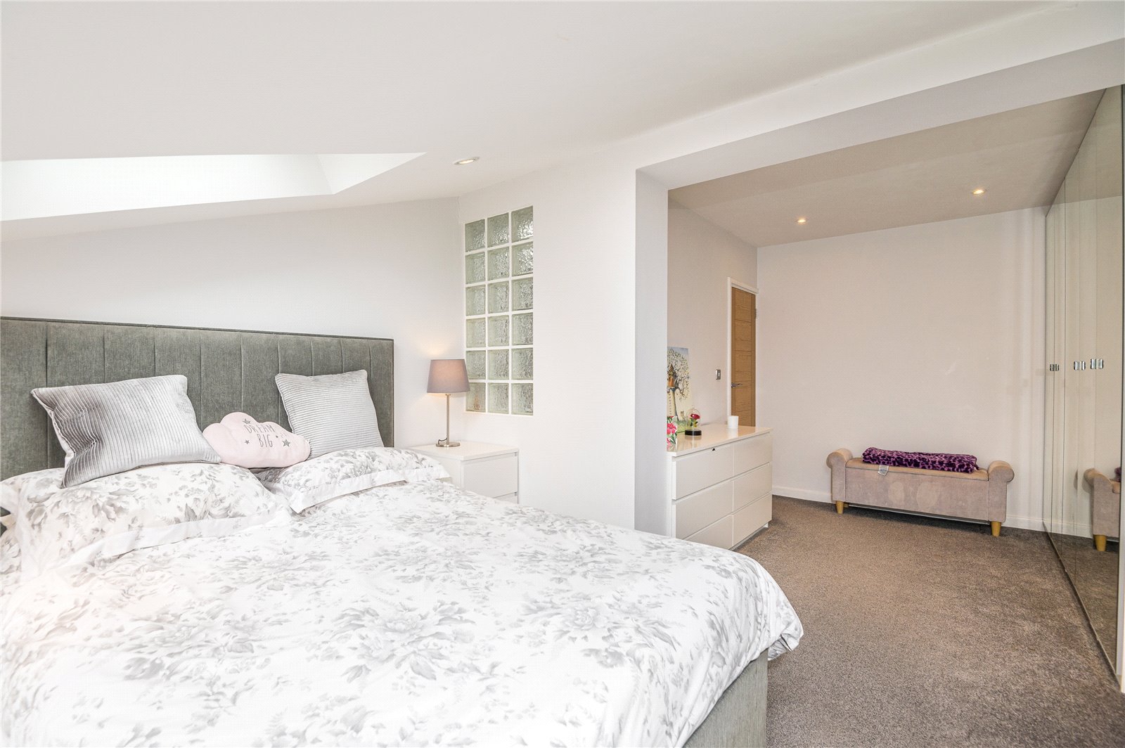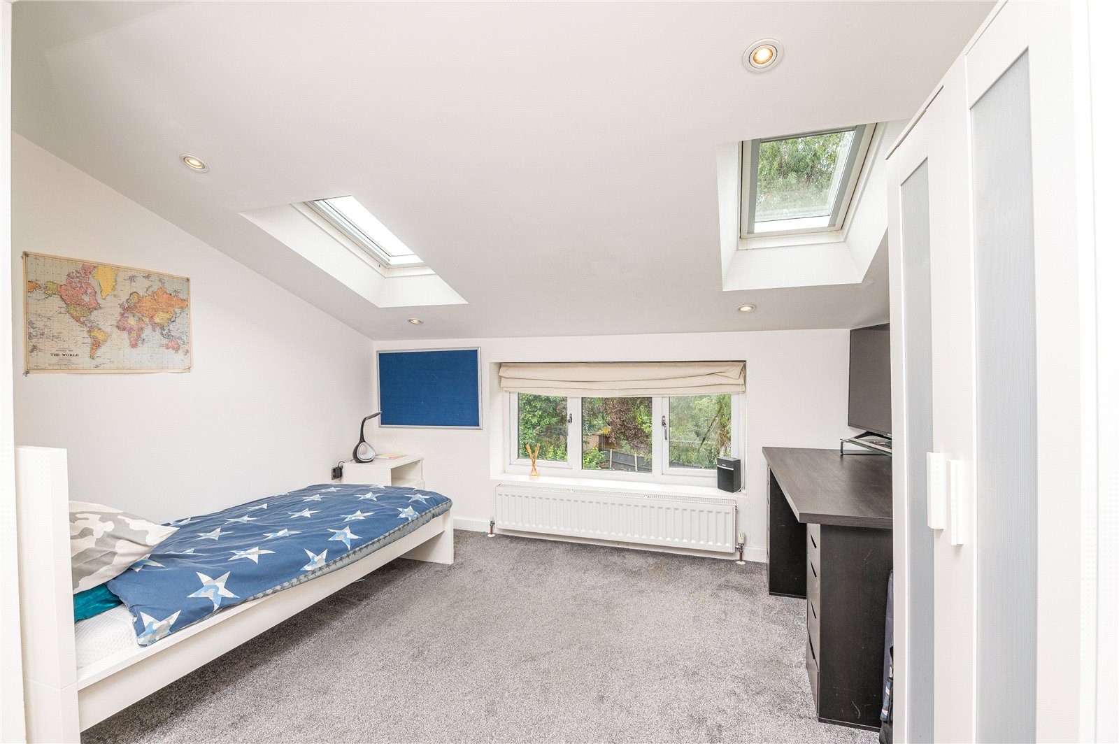 Upvc double glazed window to the rear aspect and two Velux skylight windows. Radiator, built-in mirror fronted wardrobes to one wall, smooth plastered ceiling with inset spot lighting.
