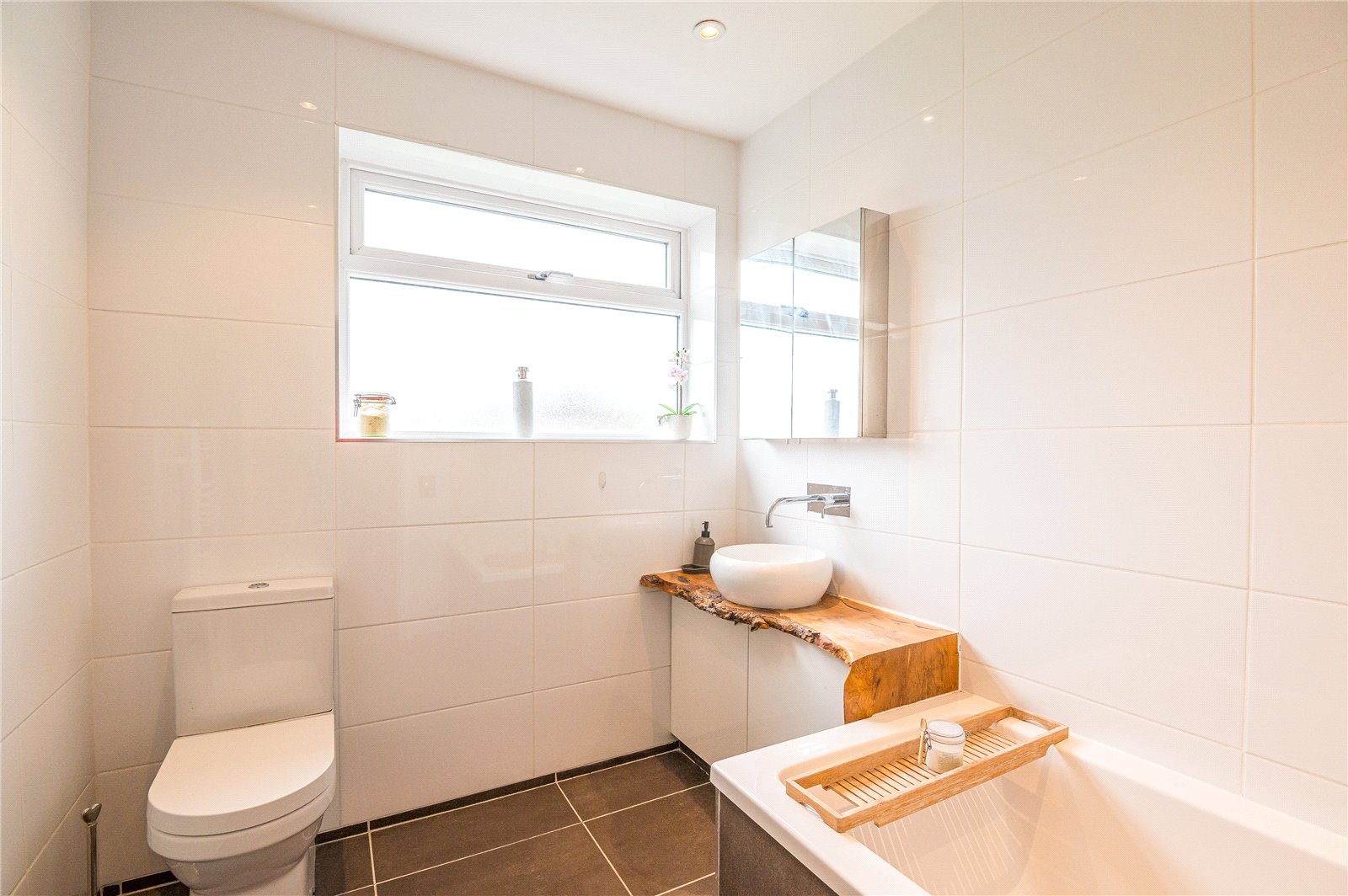 Opaque upvc double glazed window to the side aspect. Modern white suite comprising of panelled bath with multi-jet head shower and monbloc side filling waste tap, circular ceramic bowl sink with wall mounted monobloc tap set on natural wood finish vanity with cupboards below, close coupled w.c, tiled floor and tiling to full wall height, heated towel rail and smooth plastered ceiling with inset spot lighting.