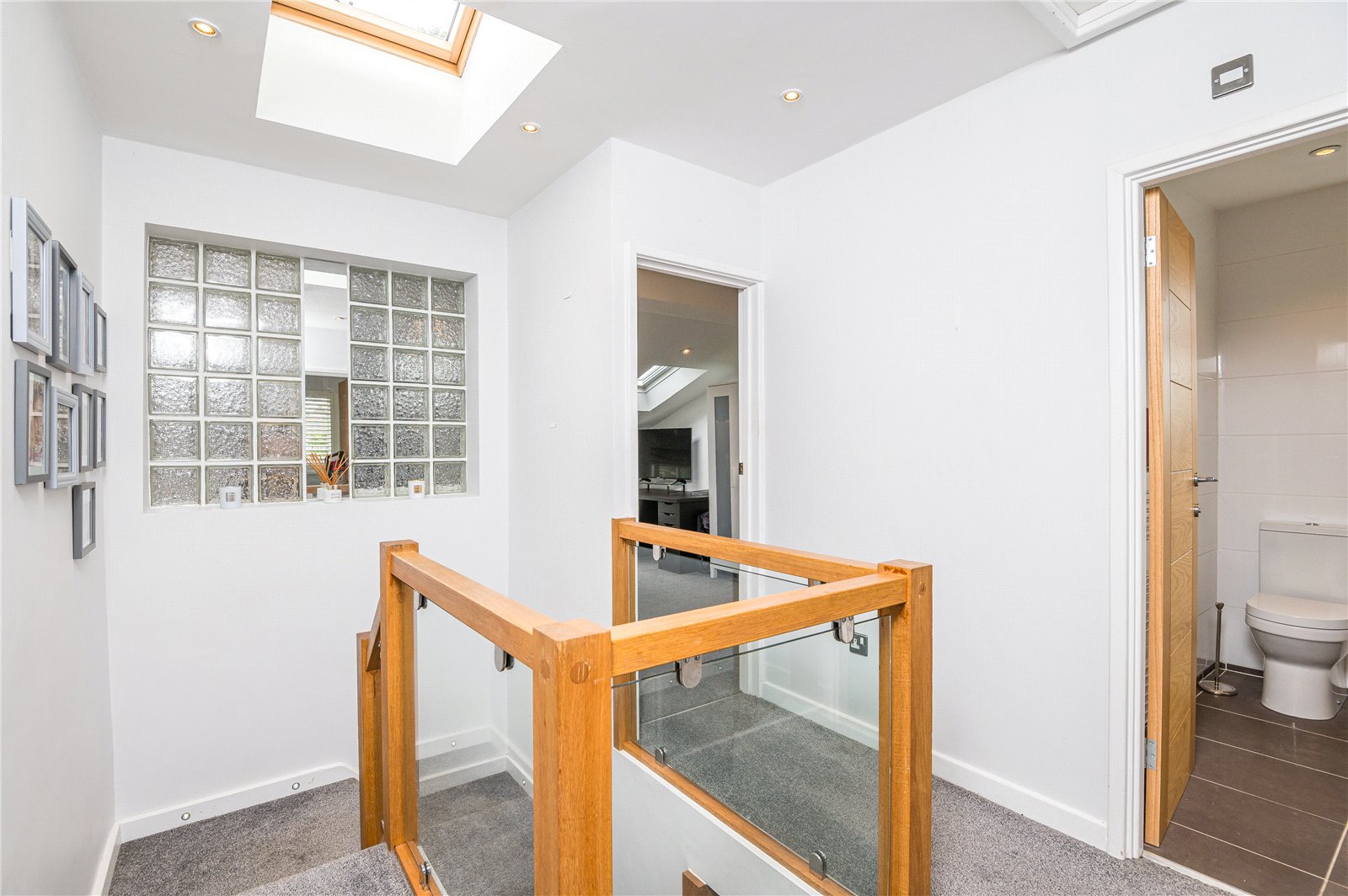 Velux window to the rear aspect. Feature galleried style oak, glass and stainless steel finished balustrade, smooth plastered ceiling with inset spot lighting, access to loft space. Doors leading to rooms: