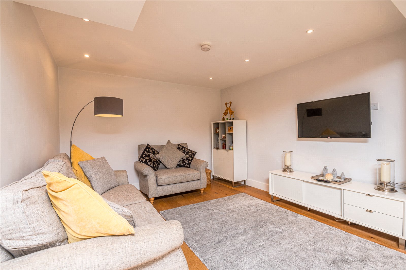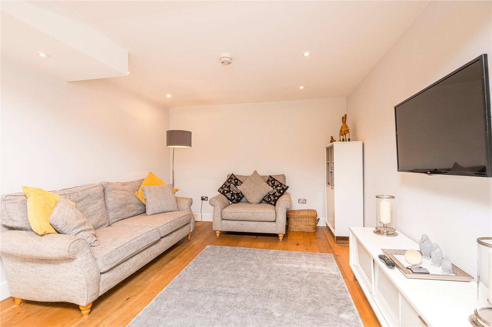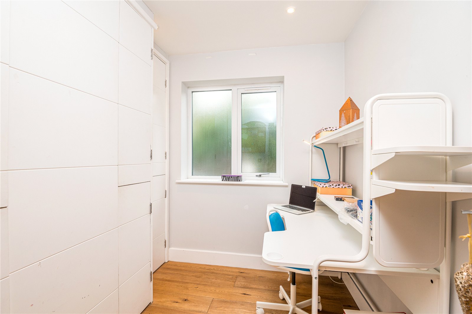 Opaque upvc double glazed window to the side aspect. Oak wood flooring, built-in cupboards to one wall concealing gas boiler and hot water tank with push fittings, smooth plastered ceiling with inset spot lighting.
