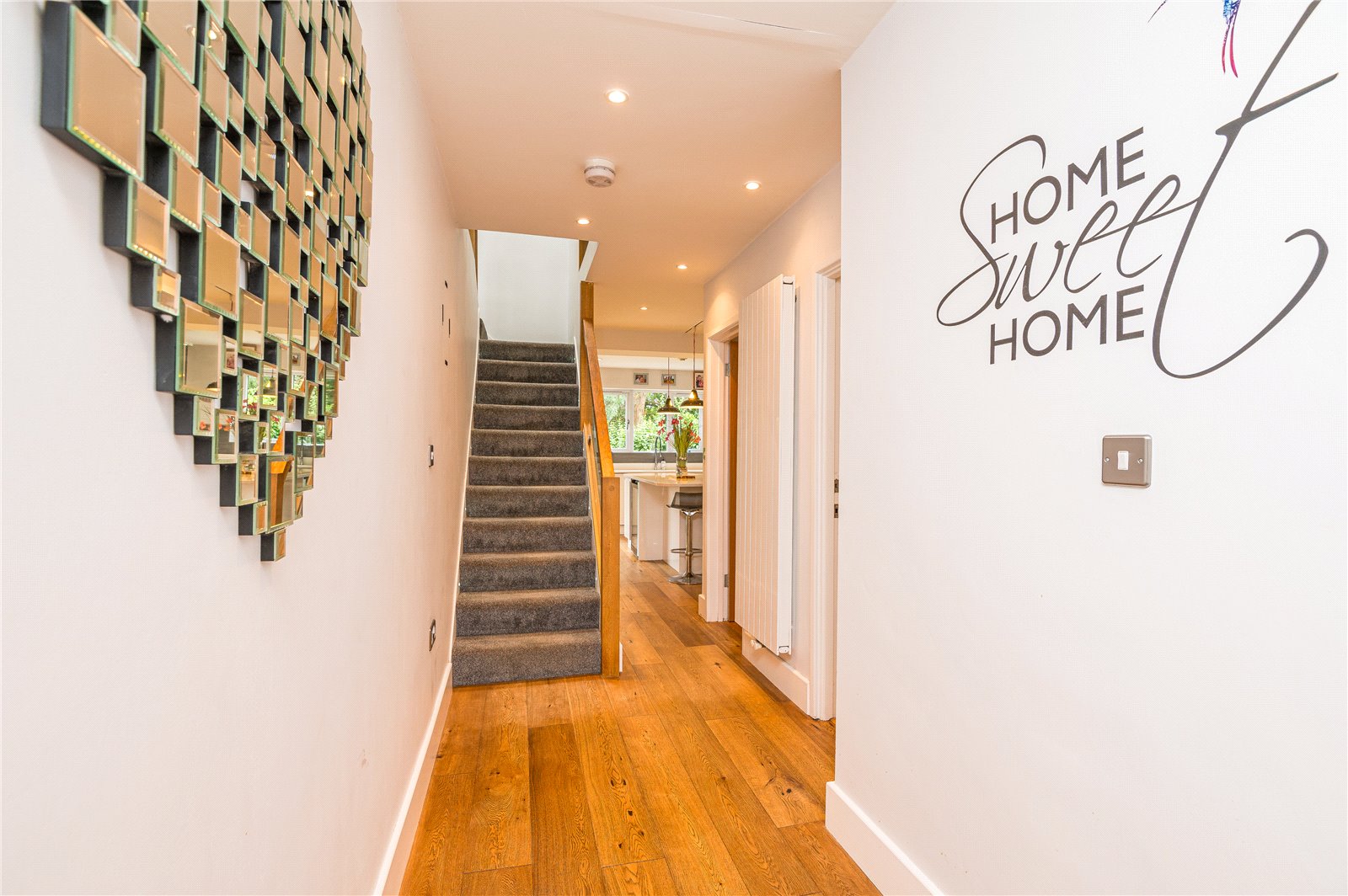Modern vertical radiator, oak wood flooring, stairs with low level light to stair treads rising to the first floor landing with modern oak, stainless steel and glass balustrade, smooth plastered ceiling with inset spot lighting. Doors leading to rooms: