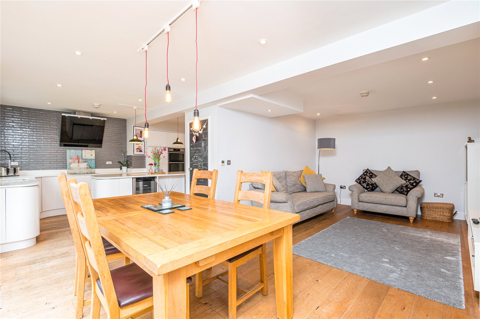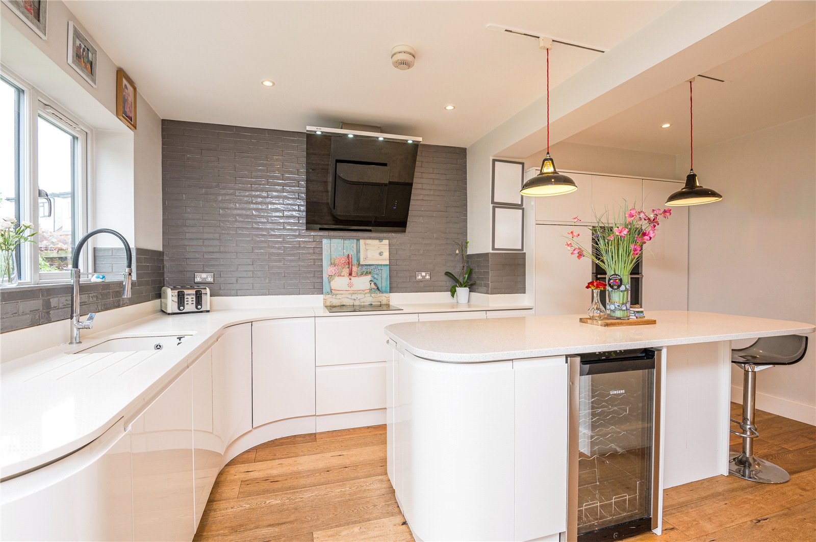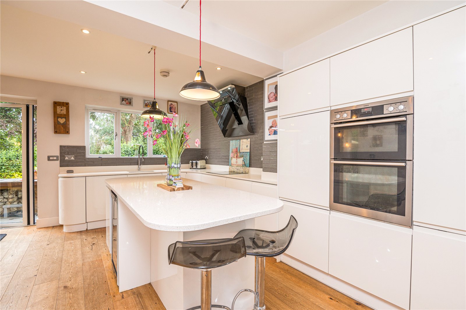 White stone work surfaces with underslung sink with monobloc tap and a range of modern white gloss fronted and concealed handle base, drawer and cupboard units including pan drawers and further tall standing cupboards with integrated four ring induction hob with modern Caple extractor canopy over with inset lighting and built-in double AEG ovens, integrated fridge and dishwasher with feature centre island unit with matching base units and breakfast bar, built-in understairs cupboard, smooth plastered ceiling with inset spot lighting, oak wood flooring with underfloor heating and wall mounted thermostat.