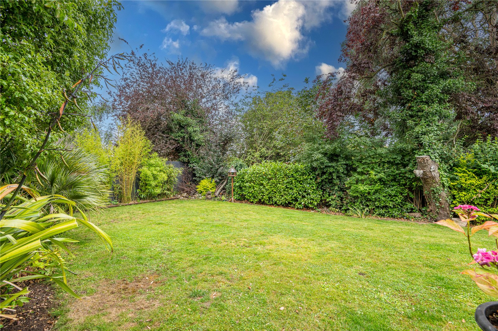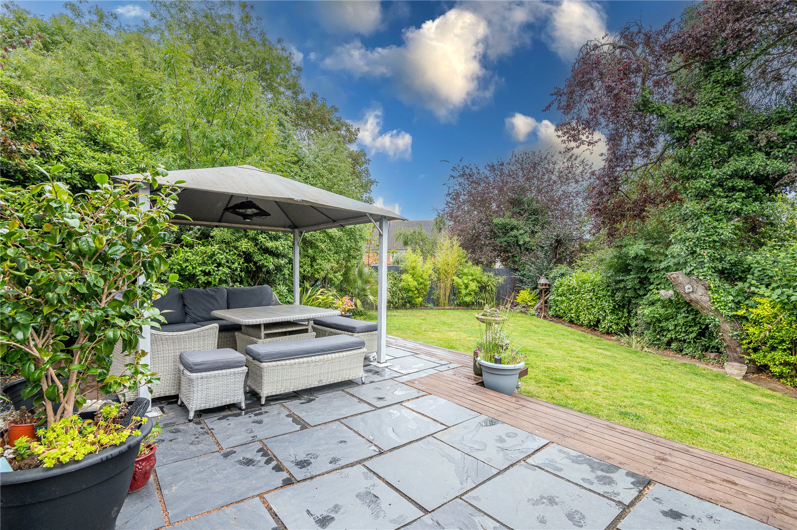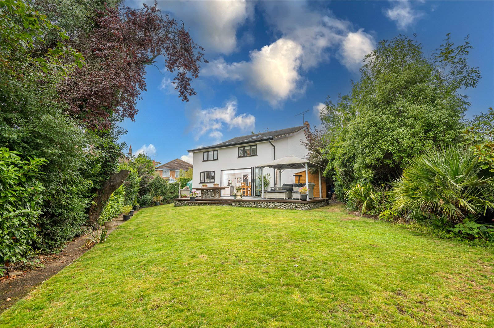 The rear garden measures an approx 75ft to the longest point and commences with a raised slate patio area with hard wood decking and steps down to the remainder of the garden which is mainly laid to lawn with a selection of flower, tree and shrub borders. Fenced boundaries. Side access. Hardstanding base for storage shed. External lights, water tap and power points.
