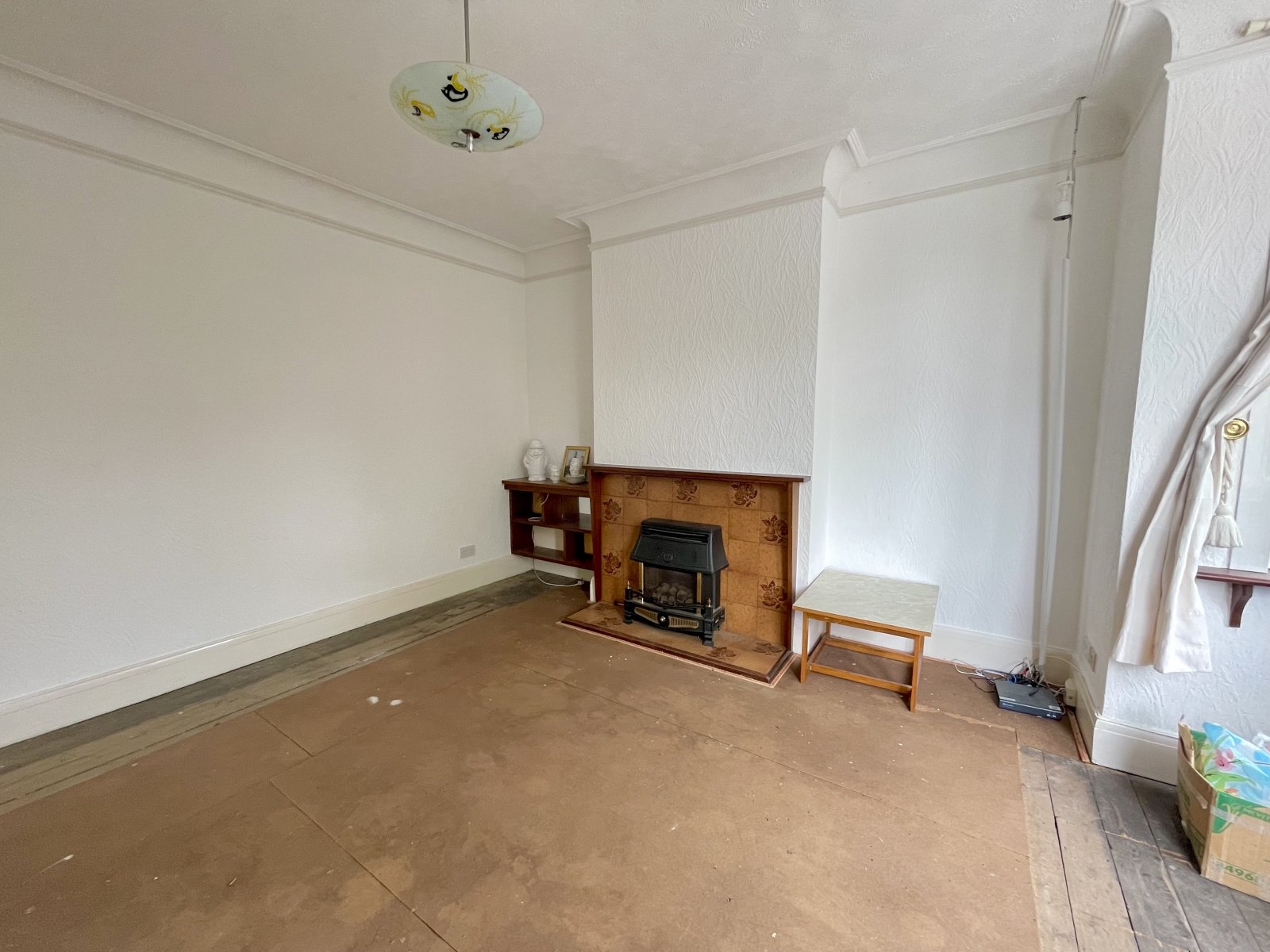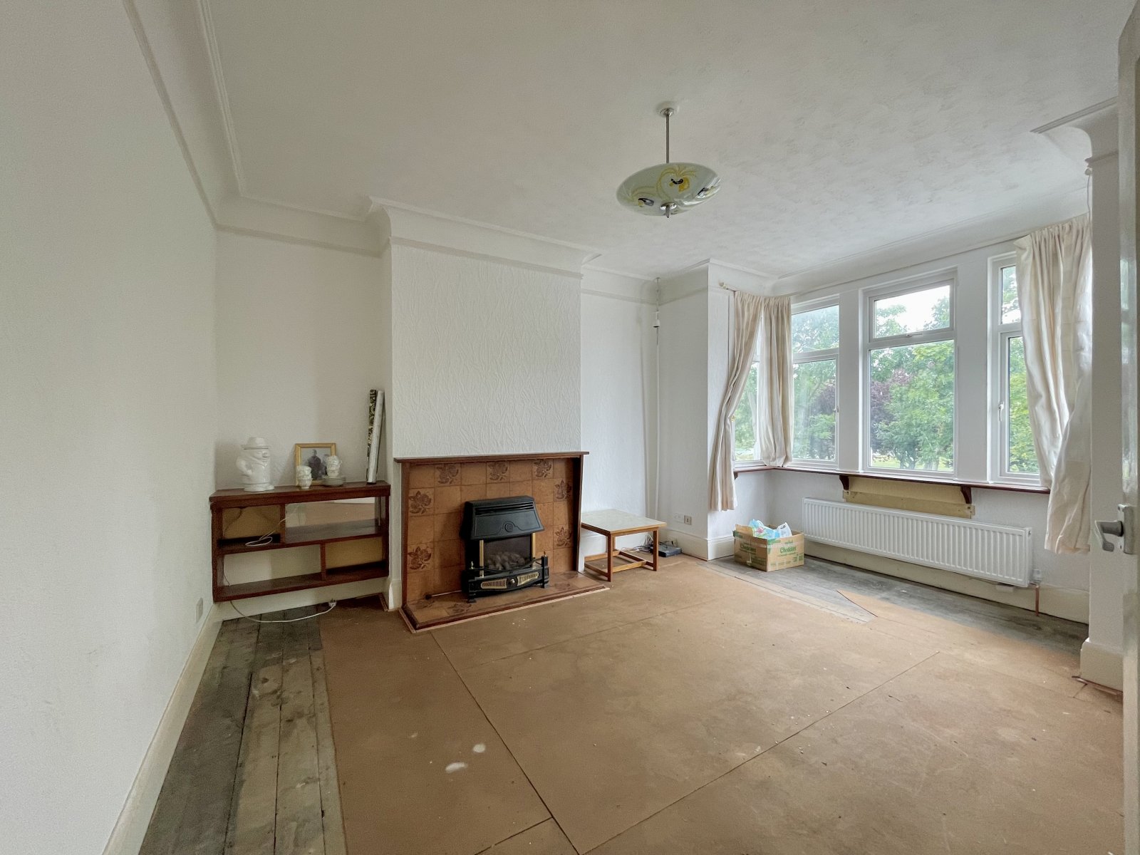 into bay. Large UPVC double glazed bay window unit to front. Wall mounted radiator. Feature fireplace with wooden mantle, tiled inset and hearth, gas fire. Fitted wooden shelving to side. High level skirting. Feature picture rail. Ornate coving to ceiling.