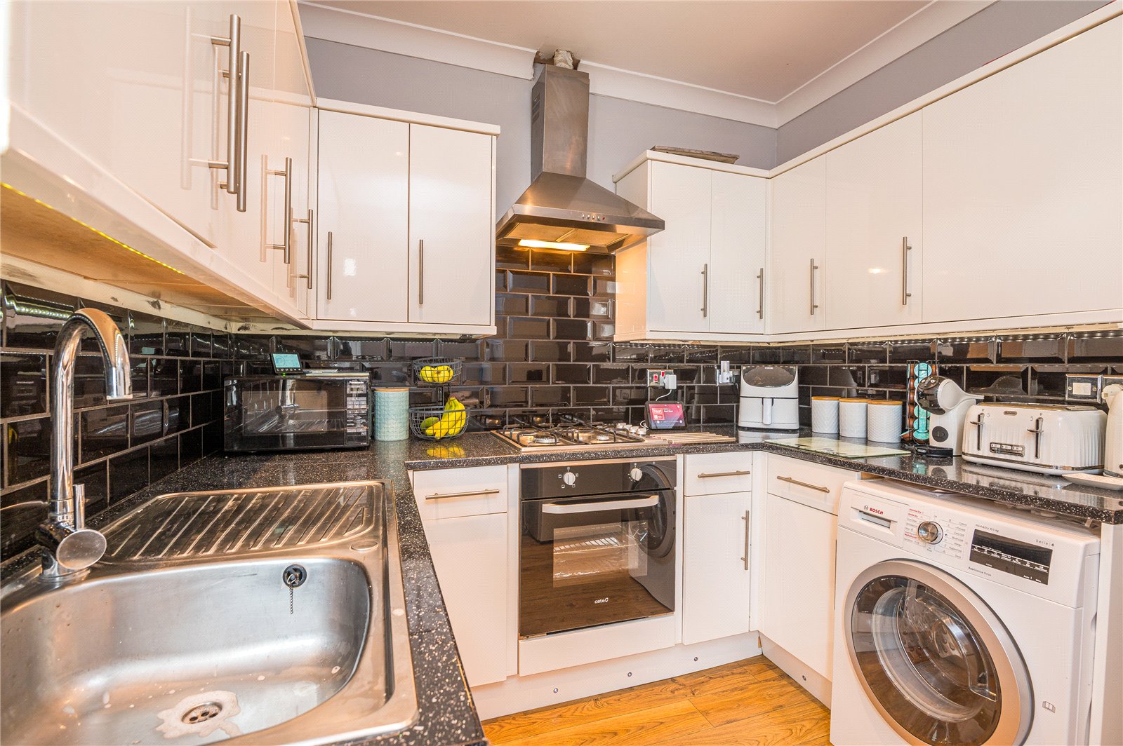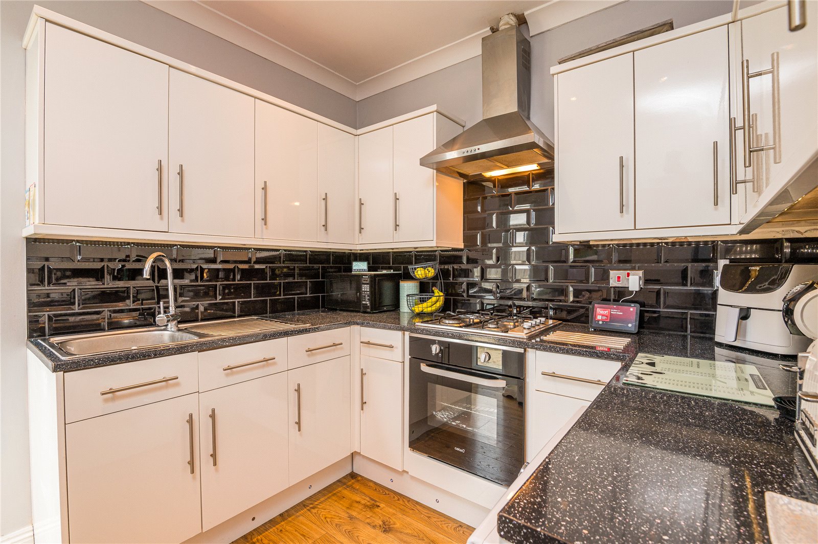 Approached via UPVC security door with inset glazed panel. Doors lead off to all rooms. Opening to kitchen. Two wall mounted radiators with fitted radiator covers. Storage cupboard to side. Wood flooring throughout. High level skirting. Coved cornice to smooth plastered ceiling with recessed LED lighting. Further drop pendant with feature ceiling rose. Wall mounted central heating control.