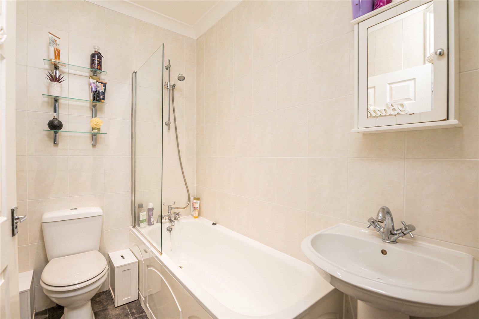 Fitted with a modern three piece suite comprising low flush WC, pedestal wash hand basin with mixer tap and panelled bath with mixer tap plus adjustable overhead shower attachment and glass shower screen. Chrome heated towel rail. Tiled effect vinyl flooring. Fully tiled walls. Coved cornice to smooth plastered ceilings with recessed LED lighting. Ceiling mounted extractor fan.