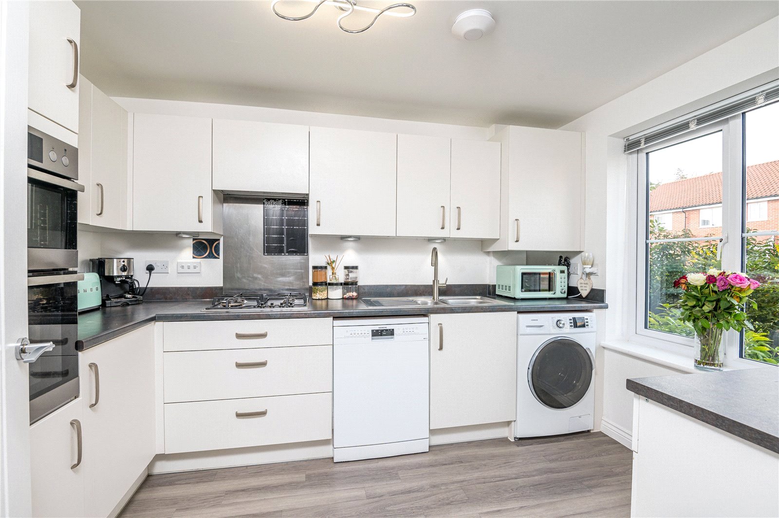 UPVC double-glazed cottage-style window to front. Grey oak-effect flooring. The kitchen has been professionally planned and fitted with a comprehensive range of base and eyelevel cabinets with rolled-edge working surface and inset one-and-a-quarter bowl stainless steel sink unit with designer mixer tap. The range of integrated appliances comprises a split-level one-and-a-half fan assisted electric oven by AEG. Space, plumbing and drainage for automatic washing machine and dishwasher. Lipped skirting. Access to cupboard housing gas condensing boiler serving domestic hot water and central heating system. Matching upstands to the working surfaces, with full-height brushed steel upstand to a four-ring gas hob with concealed extractor canopy. Space for upright fridge/freezer. Further appliance space or space for a refectory table where our clients currently have a freestanding matching double base unit. Smooth plastered ceiling.