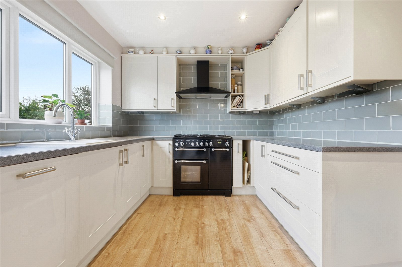 Fitted with a modern range of cream Shaker style front united and Corian work surfaces with inset sink unit with mixer tap. Range of cupboards and drawers below. Built in Neff dishwasher with matching decor panel. Space for double Range cooker with extractor hood above. Space for American fridge/freezer. Space and plumbing for washing machine. Wall mounted storage cabinets with lighting below. Part tiled walls. Wood effect flooring. Concealed gas fired central heating boiler. Recessed ceiling lighting. Double glazed window and door overlooking the rear garden.