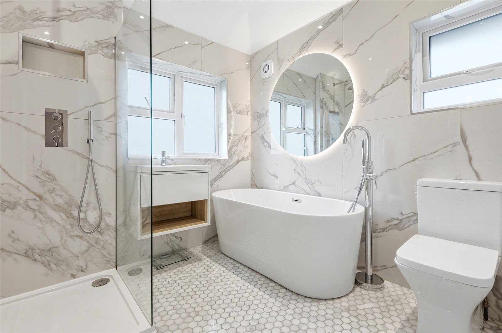 UPVC double obscured glazed widow to rear and side. Bathroom is fitted with a luxurious four piece suite comprising low flush WC, wall mounted wash hand basin with mixer tap and storage cupboard beneath. Free standing bath with mixer tap and detachable showerhead and walk in shower cubicle with glass shower screen, wall mounted mixer, rainfall showerhead plus detachable showerhead. chrome heated towel rail. Marble tiled floors. Fully tiled walls. Smooth plastered ceilings with recessed LED lighting. Wall mounted extractor fan.