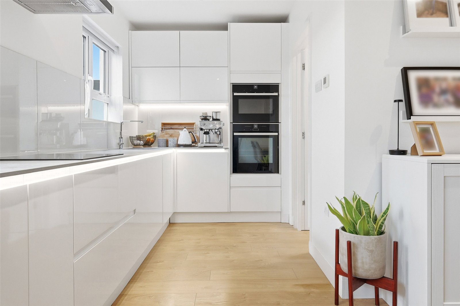 maximum. Large UPVC double glazed French doors leading on to rear garden. Two UPVC double glazed windows to rear. Kitchen is fitted with a modern and contemporary range of high gloss units incorporating a slim line squared edge working surface. Under mount stainless steel sink with mixer tap, grooved draining board. Inset Neff four burner induction hob with Neff canopied extractor hood above. Integrated Neff 'slide and hide' double oven. Integrated dishwasher. Fully tiled splash backs. Wood effect laminate flooring throughout. High level skirting. High level designer radiator. Underfloor heating throughout. Smooth plastered ceiling with recessed LED lighting. Door to front provides access to the: