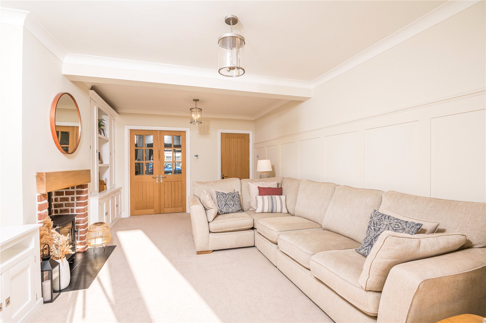 This bright and well proportioned living room has an excellent range of built in storage cabinetry and display selves Attractive red brick fireplace with oak timber mantel and fitted log burner. Slate tiled hearth. Radiator. Coved ceiling. Feature panelling to one wall. Glazed double doors leading to family room. Wide opening to -