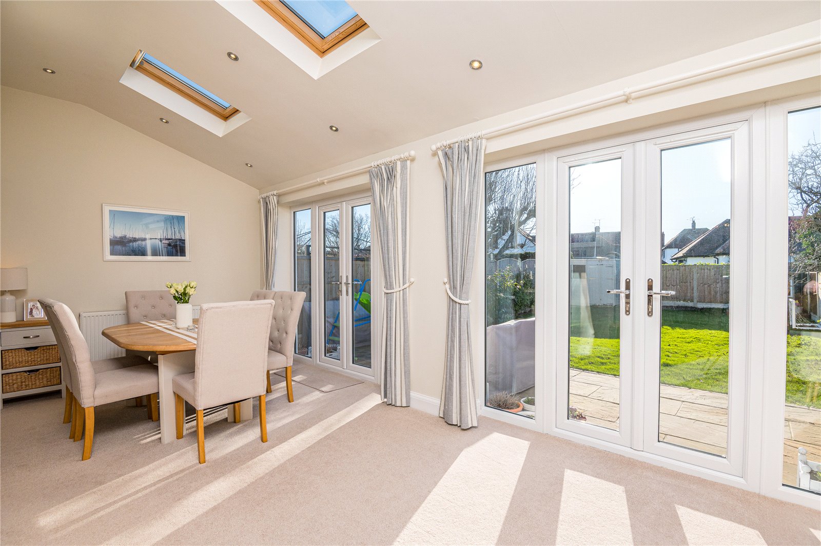 This bright and spacious living area has a vaulted ceiling with three double glazed skylight windows. Two sets of double glazed french double doors and side screens framing lovely views across the rear garden. Radiator. Recessed ceiling lighting. Wide opening to -