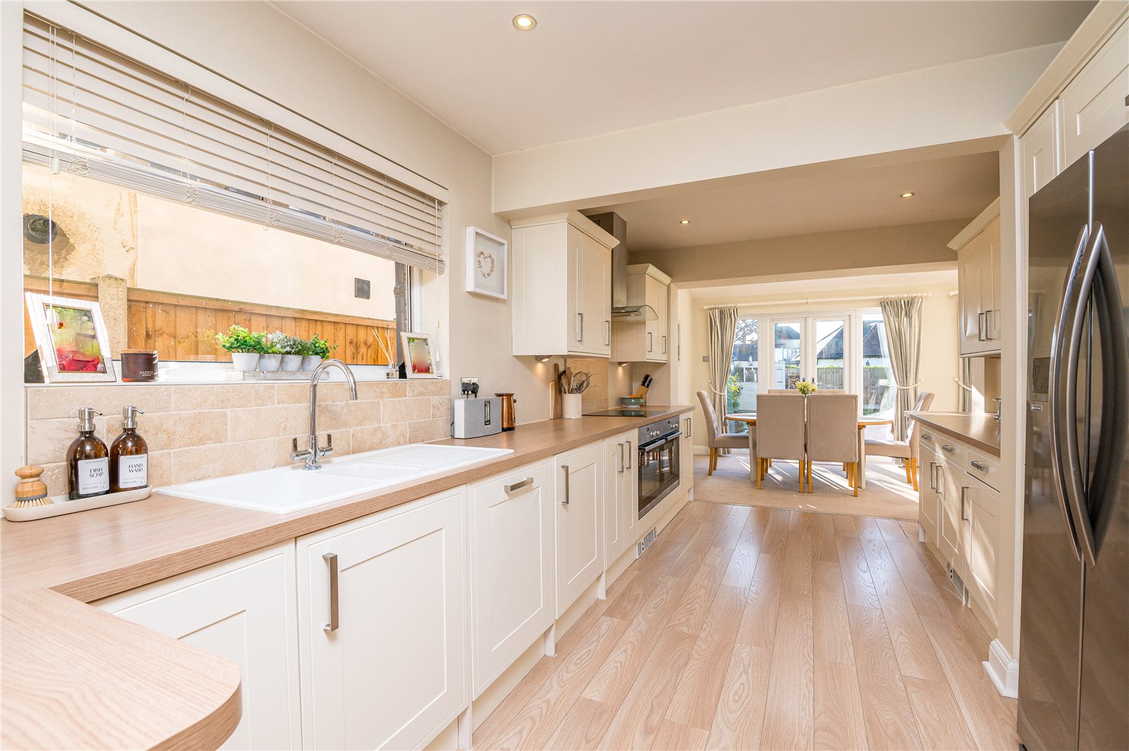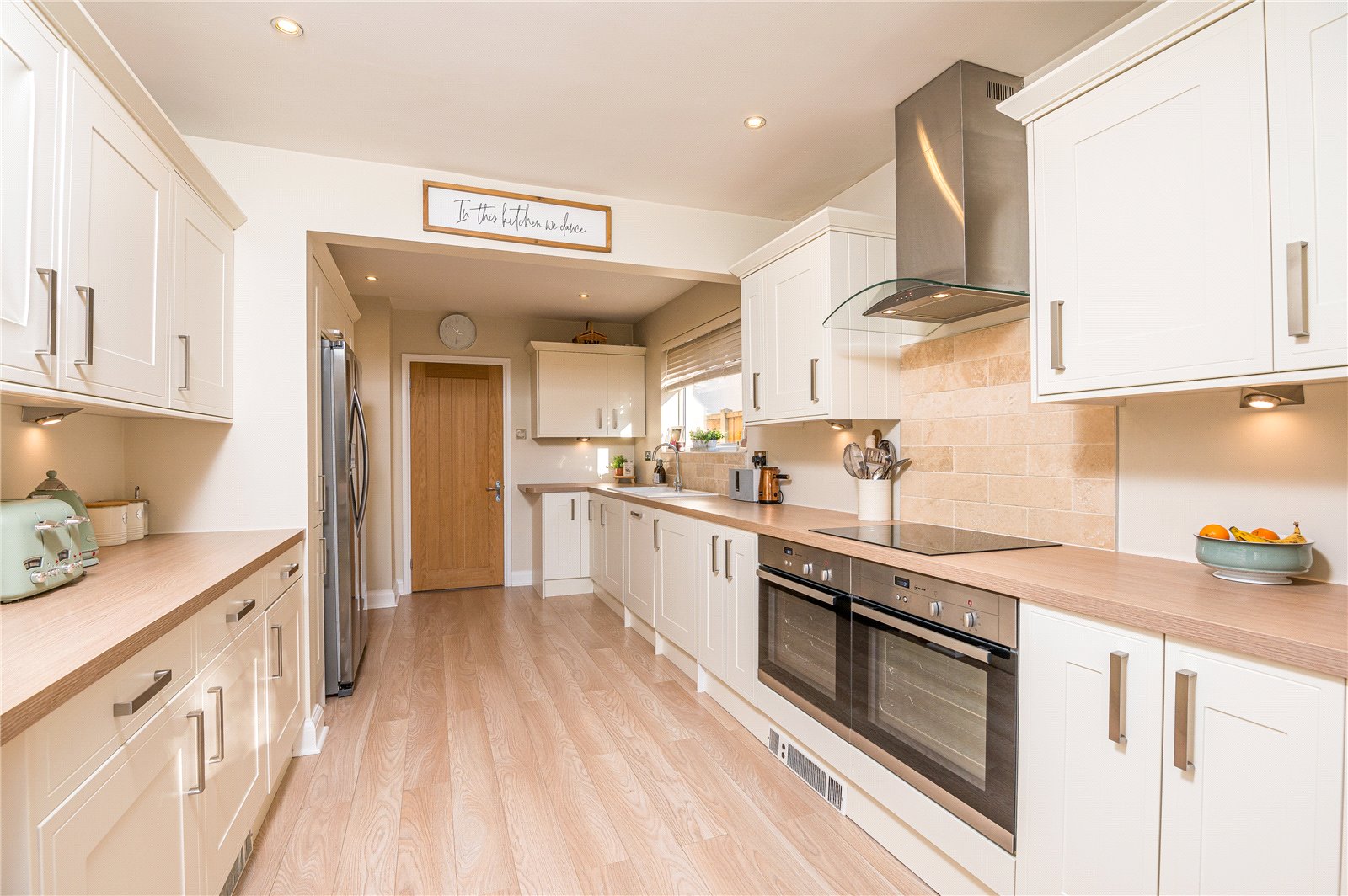 Fitted with an excellent range of modern shaker style fronted units with extensive work surfaces. Inset sink unit with mixer tap. Range of cupboards below. Built in dishwasher and washing machine with matching decor panels. Inset Neff induction hob with glass/stainless steel extractor hood above. Built in twin Neff ovens below. Further matching work surface with cupboards and drawers below. Recess for American double fridge freezer with larder cupboards to either side. Matching range of wall mounted storage cabinets. Designer radiator. Two plinth heaters. Recessed ceiling lighting. Double glazed window to side.