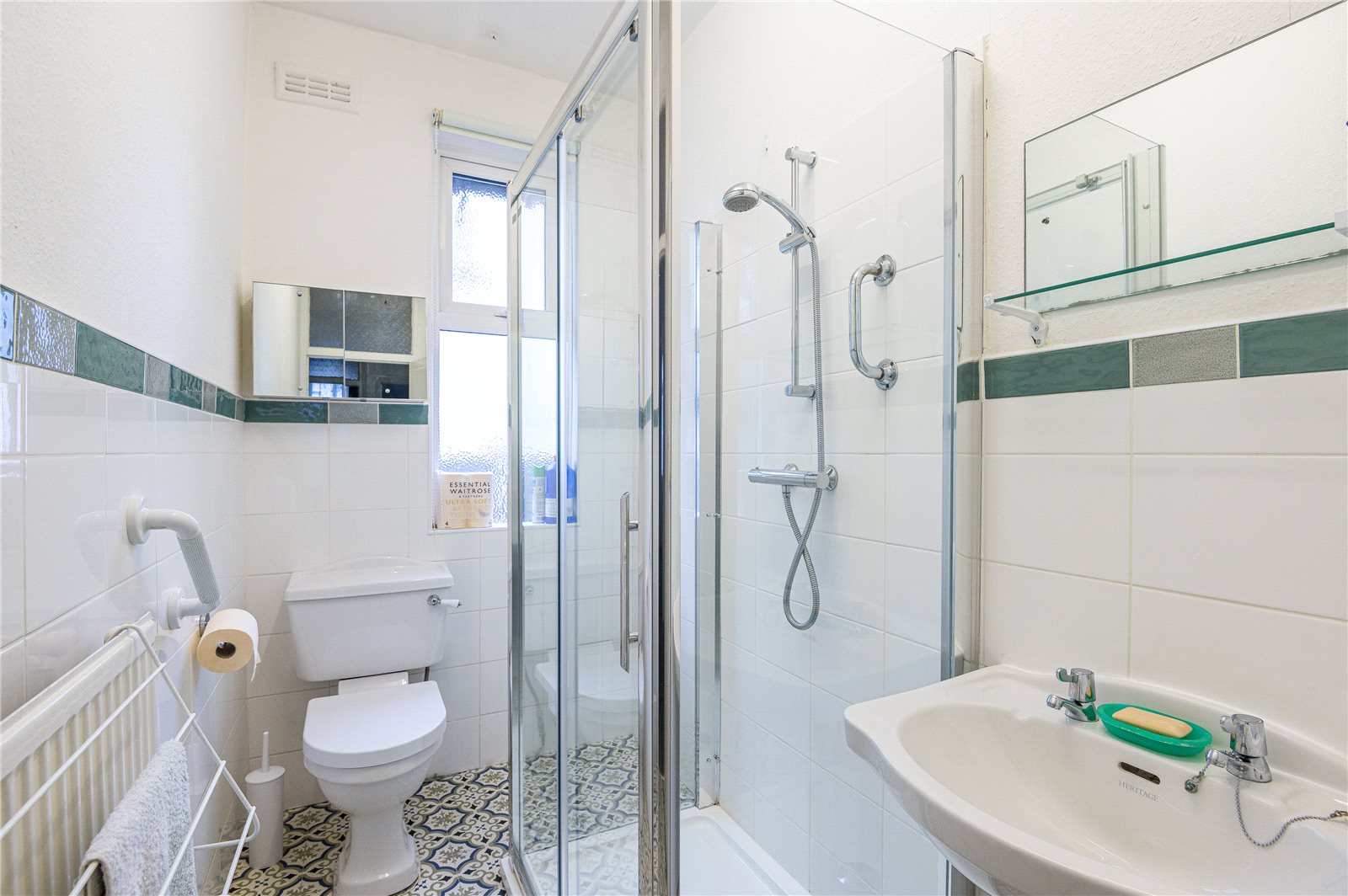 Modern white suite comprising tiled shower cubicle. Pedestal wash basin. Low flush WC. Part tiled walls. Radiator. Built in storage cupboard. Double glazed window to side.