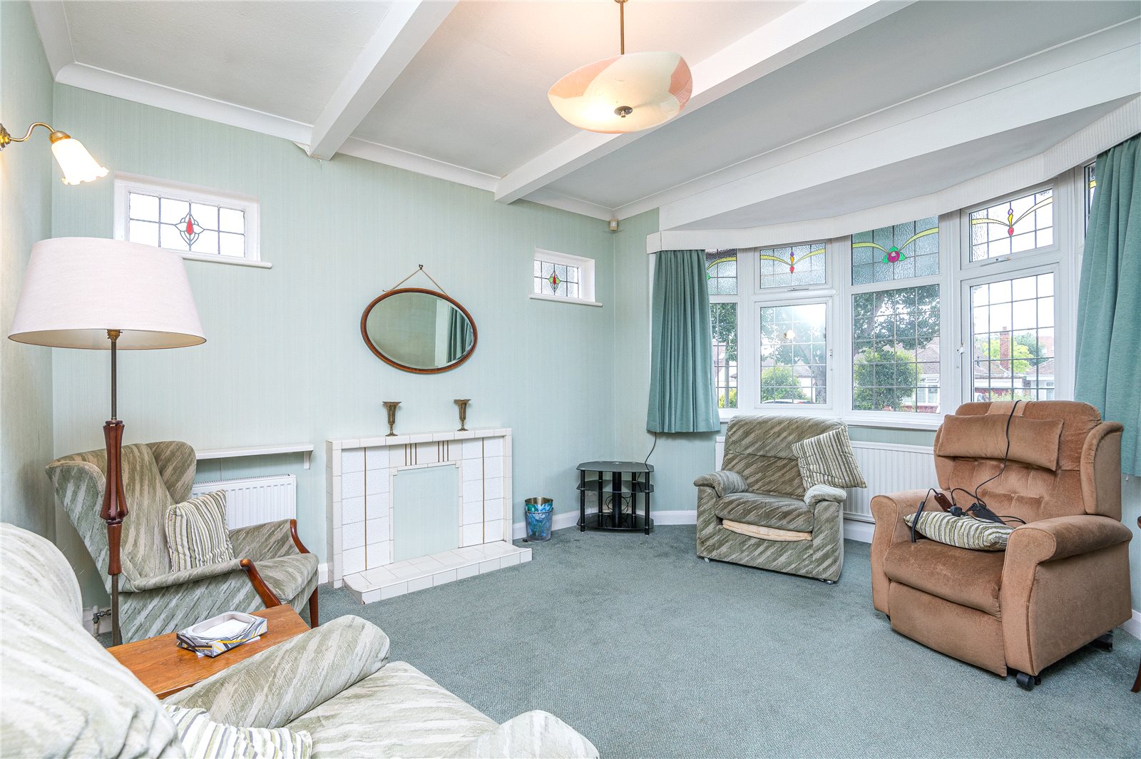 Into wide double glazed curved bay window to front. Two pretty stained glass windows to side. Tiled fireplace with open grate. Two radiators. Coved ceiling.