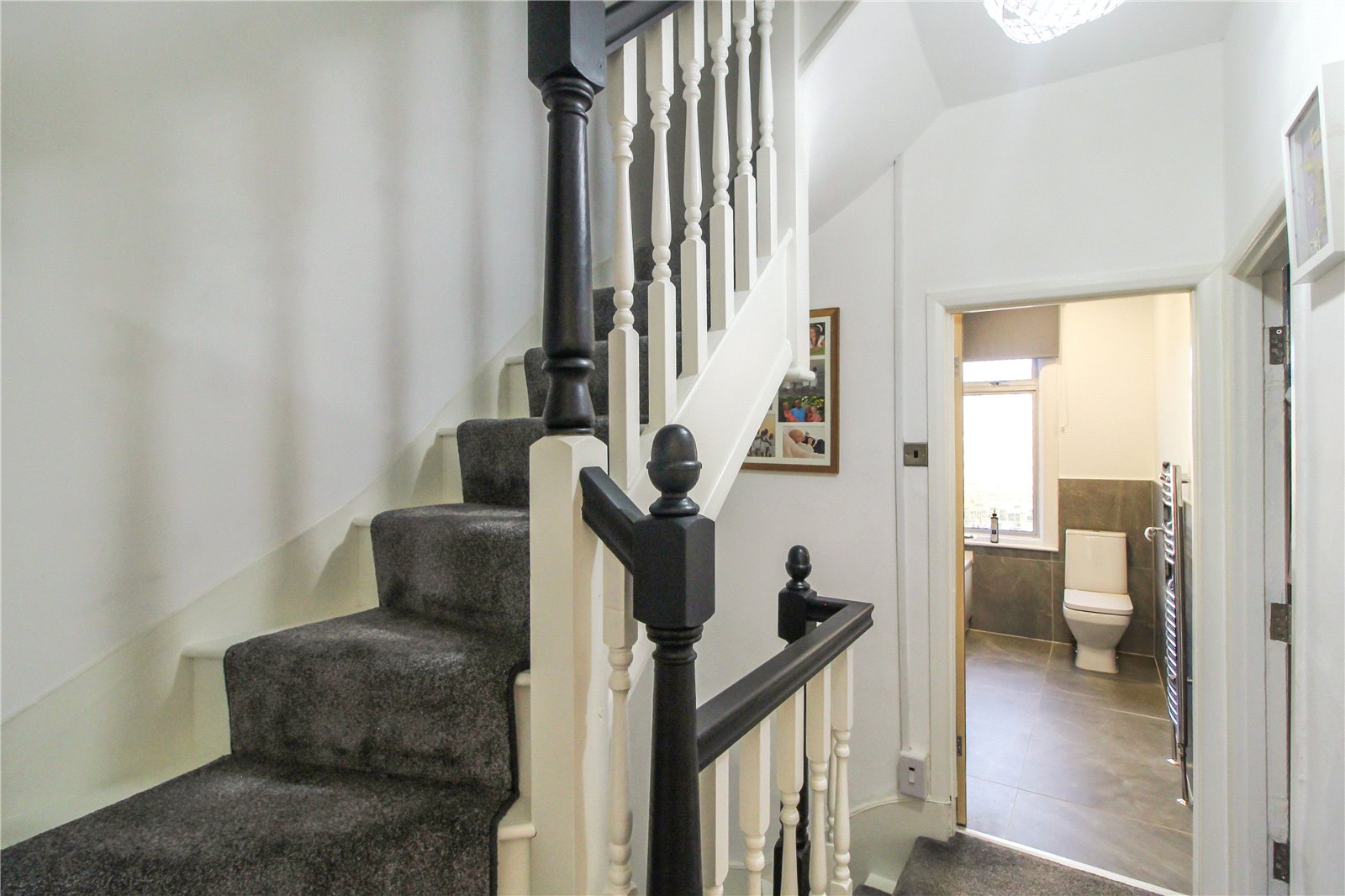 Carpeted stairs from the entrance hall leading to the first floor. Smooth Plastered walls and ceiling, completed with ceiling light. Doors leading to: