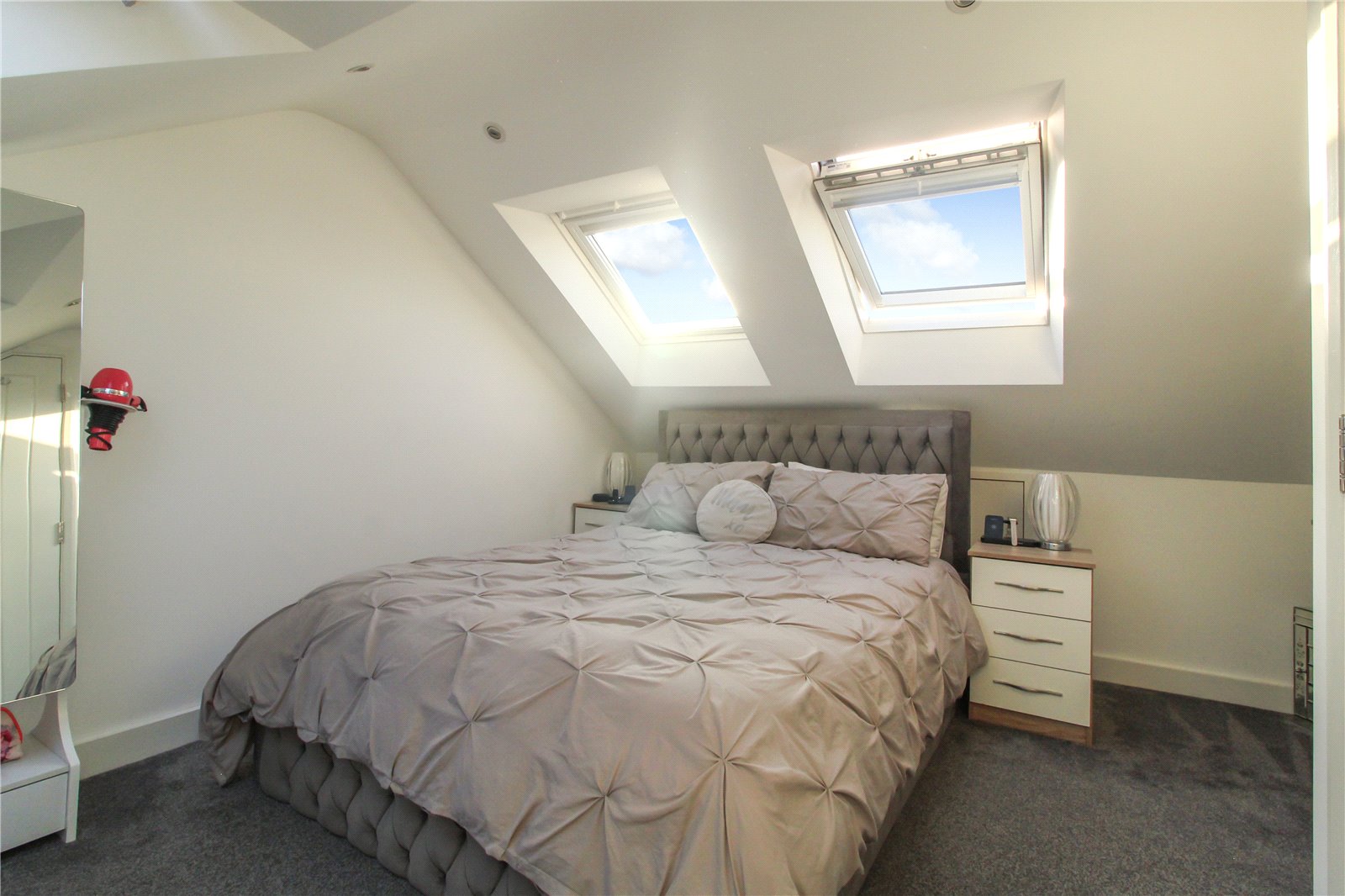Carpeted stairs from the first floor leading up to the master bedroom on the second floor. Three uPVC double glazed Velux windows to front and rear. Carpet to floor, skirting, radiator, and access into eaves storage. Smooth plastered walls and ceiling, completed with fitted spotlights.