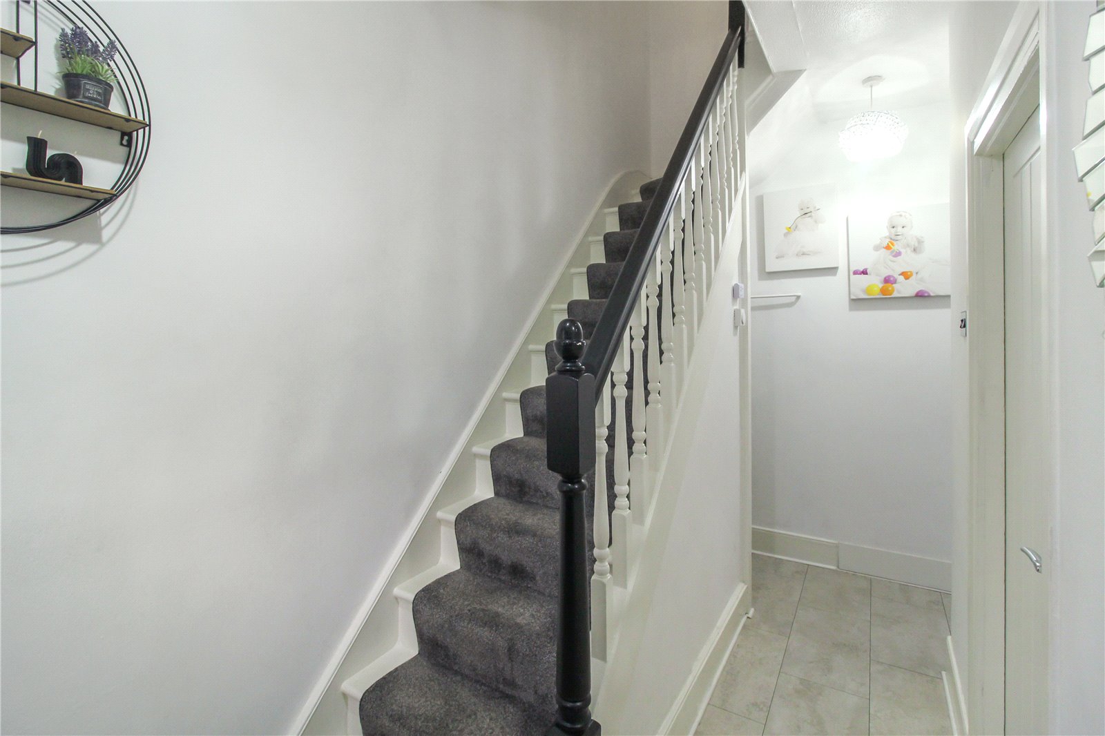 Stepping through the front door into the entrance hall. Tiled floor, skirting, radiator and carpeted stairs leading to the first floor. Smooth plastered walls and ceiling, completed with ceiling light. Doors leading to: